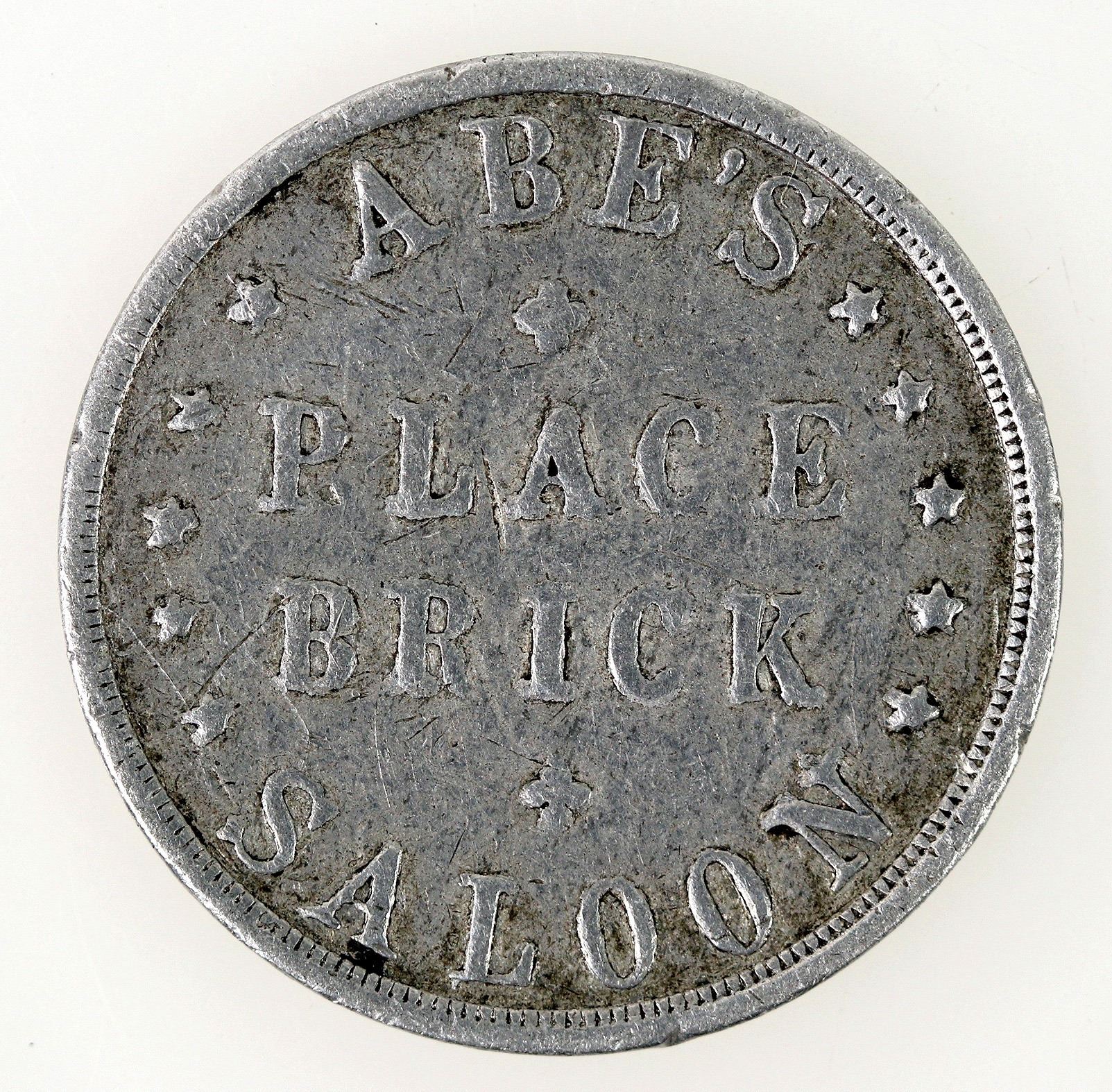 ABE'S / PLACE / BRICK / & / SALOON // A.B. DANIELS & CO. / GOOD FOR / ONE / DRINK / DOUGLAS, WYO. TC-277137; Bowker DG24. Round, aluminum, 31mm. Very rare!