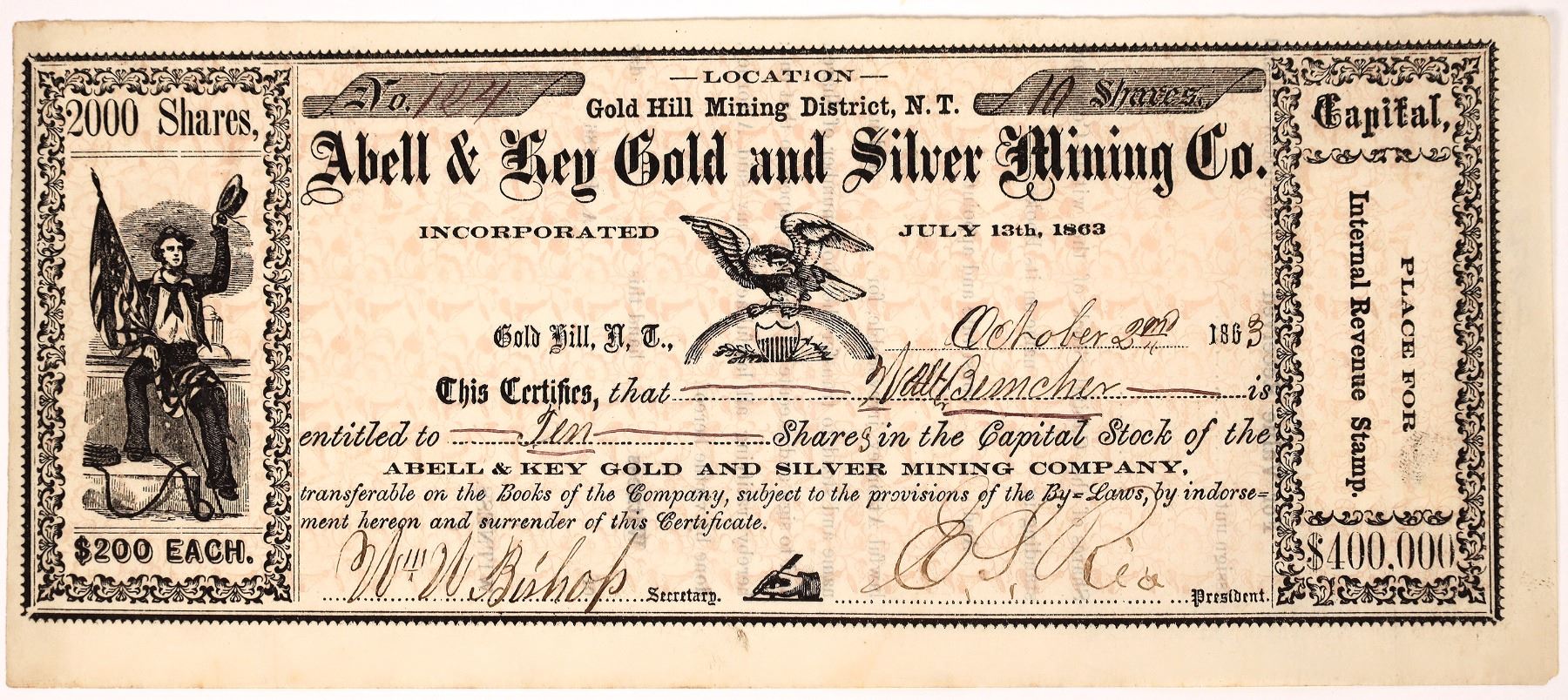 Abell & Key Gold & Silver Mining Co. – Gold Hill Mining District, Storey Cty., N.T. – Cert. #104 issued to Walt Bemcher on Oct. 2, 1863, for 10 shares. Signed by William W. Bishop as Secretary and by S. L. Rice as President. Incorporated in Gold Hill on July 13th, 1863, and capitalized at $400,000; 2,000 shares at $200 per. Vignette of an eagle and one of a sailor holding a flag. Uncancelled. Gold Hill Nevada Franklin Collection