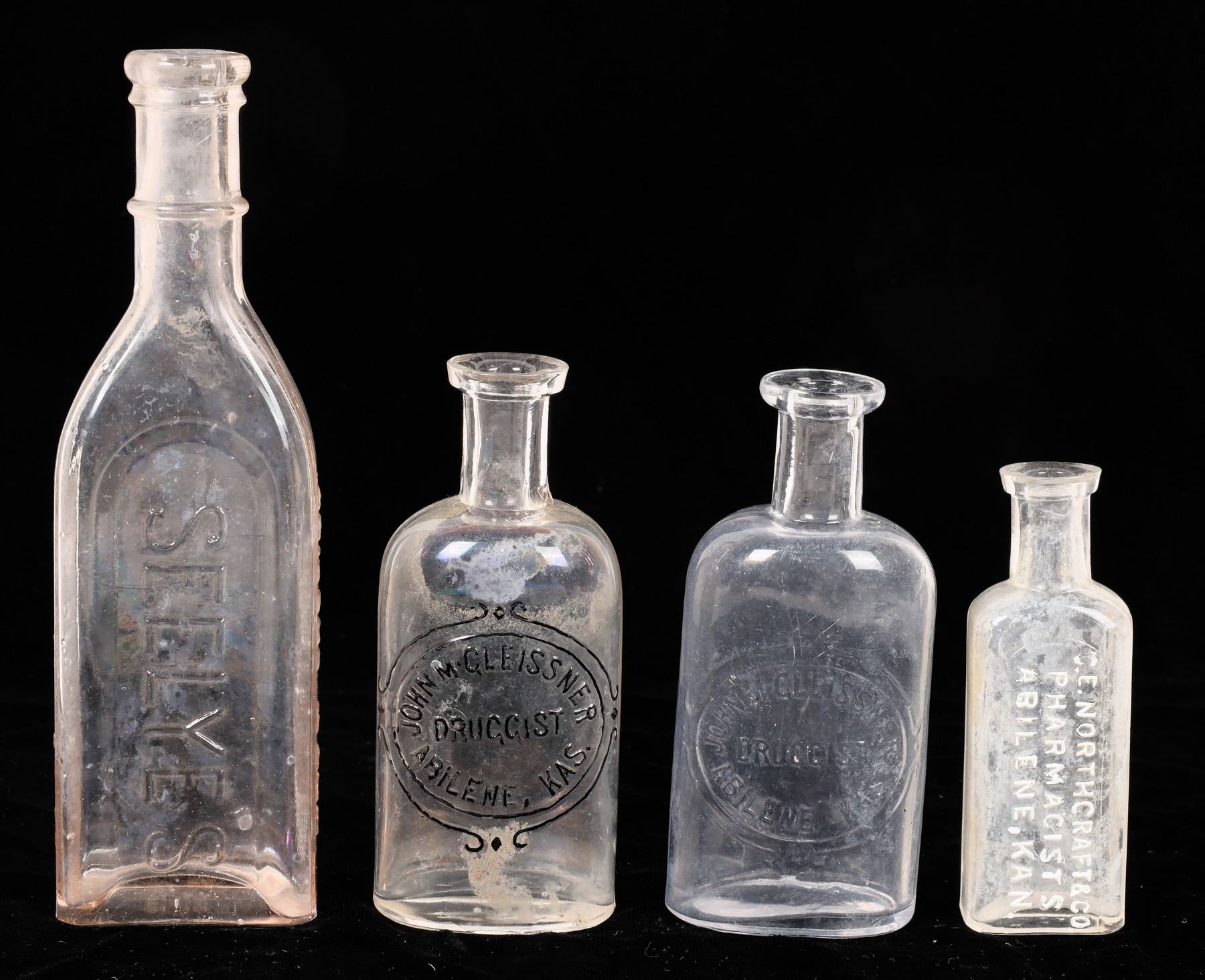 5 Abilene medicine bottles. Seelye's 6.75". C E Northcraft 3.75". John Gleissner 4.25" and 4.25" black-2 base bruises.