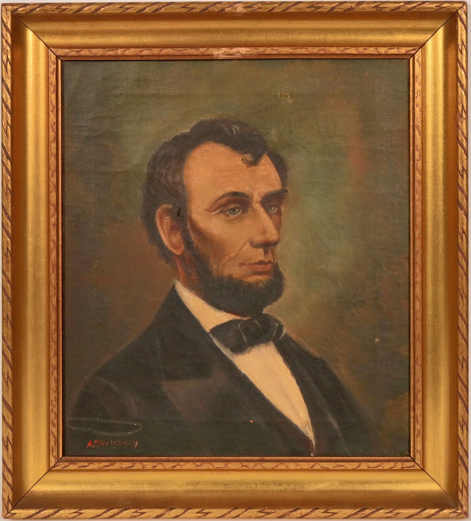 Nice looking painting by A. S. Hewsha(?). 15.5 x 13.5" visible. Frame is 20 x 18". Painting has bends where the painting rested on the old inner frame. Old frame is golden. State: City: Date: