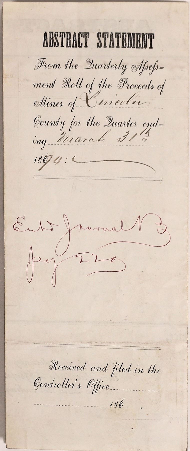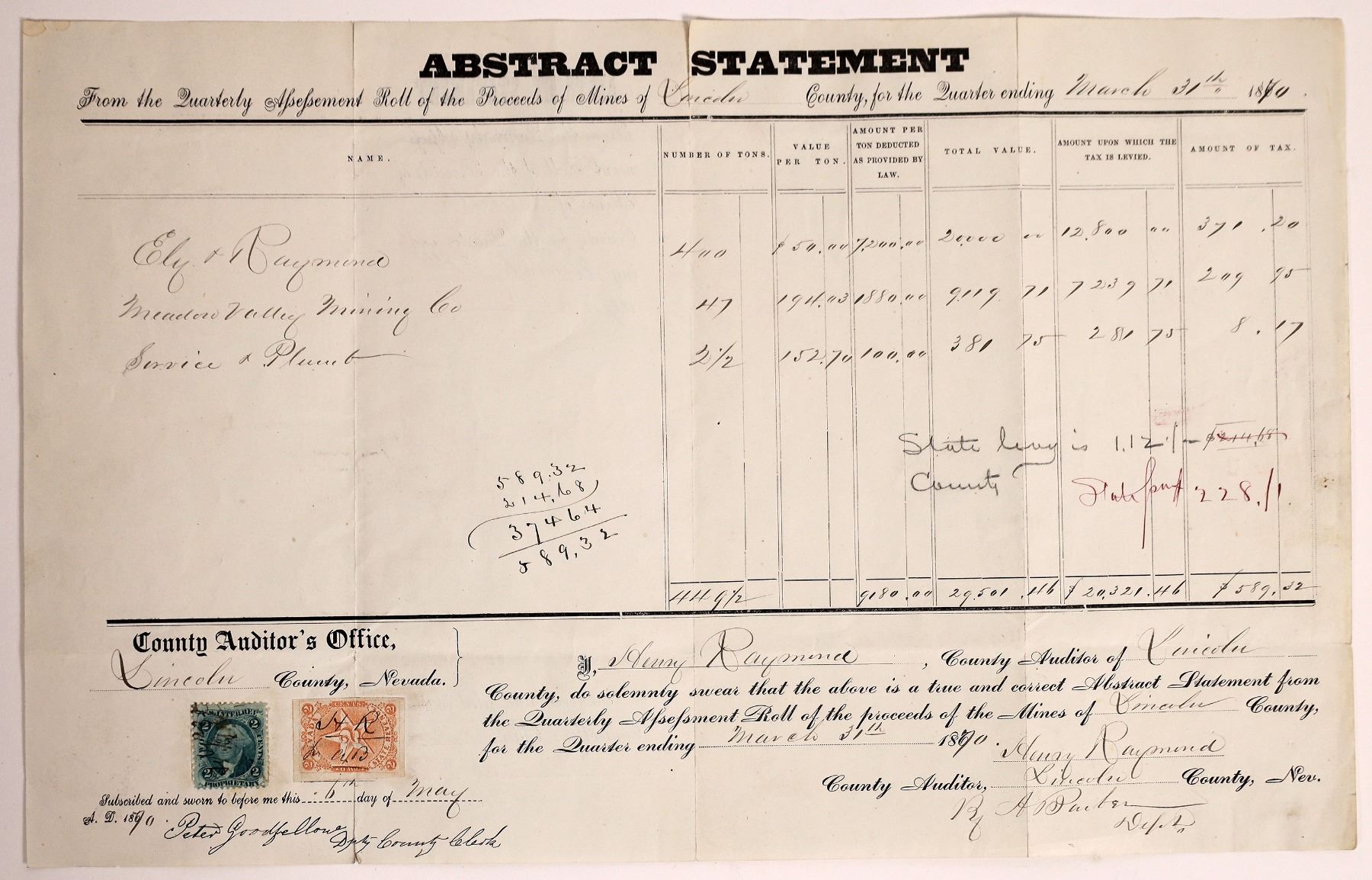 For March of 1870. Three mines are listed by owner. The Ely & Raymond Ò one of Lincoln County's most famous mines Ò was the main producer. Also listed was the Meadow Valley and Service & Plumb. Total production was 449 O pounds. Has a 2 cent orange Nevada revenue stamp. Also signed by auditor Henry Raymond - not to be confused with William Raymond the mine owner. Lincoln County Nevada