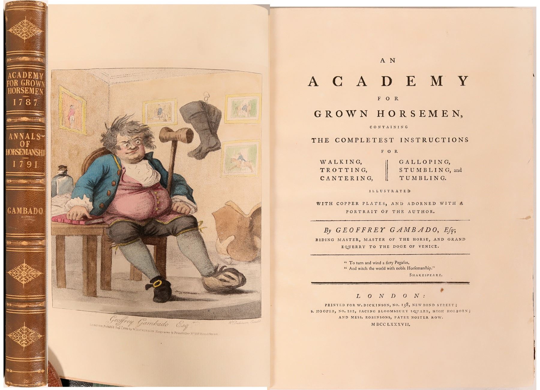 An Academy for Horsemen containing complete Instructions for Walking, trotting, galloping, stumbling, tumbling, cantering. Illustrated with copper plates and a portrait of the author by Goeffrey Gambado; London, 1787 and bound with in one volume Annals of Horsemanship:Containing accounts of accidental experiments, and eperimental accidents, both successful and unsuccessful communicated by various correspondence to Goeffrey GAmbado... London, 1791. This book is an alltime classic. Gambado must have had quite a sense of humor, as many of the illustrations are very humorous, somewhat in the style of the early Judge Amgazine of the 1880's which was all humorous pokes at politics etc. The portrait of Gambado alone is worth the price here. Bookplate: Presented to Major E.W.M. Powell, DSO by the 132nd BAttery Royal Field Artillery, April 1906-October 1909.