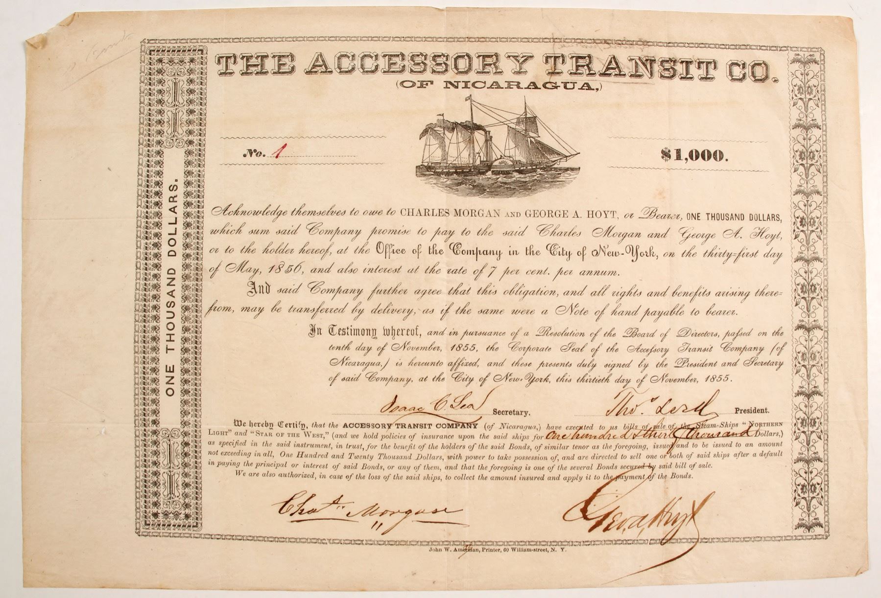I/U #1 Charles Morgan and George Hoyt $1000 7% bond. Steamer vignette. "The Accessory Transit Company was a company set up by Cornelius Vanderbilt and others during the California Gold Rush in the 1850s, to transport would-be prospectors from the east coast of the United States to the west coast. At the time, an overland journey across the US was an arduous undertaking and could last many weeks. The Accessory Transit Company instead took passengers by steamer from New York to San Juan del Norte on the Caribbean or Mosquito Coast of Nicaragua. From there, they travelled up the Rio San Juan to Lake Nicaragua, crossing the lake to the town of Rivas. A stagecoach then crossed the narrow isthmus to San Juan del Sur, where another steamer traveled to San Francisco. The ATC provided the cheapest route to California from the east coast, and was soon carrying 2,000 passengers a month at a fare of $300 each, later reduced to $150. The wealth generated by the route attracted efforts to take it over, and in 1854 the US Navy bombarded San Juan del Norte in response to demands from the town authorities that the company vacate their premises immediately. In 1855, the filibuster William Walker installed himself as President of Nicaragua, taking over the ATC's assets in the country in the process; he was ousted in 1857 by forces backed by Vanderbilt. Having regained control of the ATC, Vanderbilt approached the Pacific Mail Steamship Company and the United States Mail Steamship Company [1], which operated routes across Panama, and offered to stop running the Nicaragua route in return for a $40,000 monthly stipend. The companies accepted this offer, and a year later increased the stipend to $56,000 when Vanderbilt threatened to reopen the Transit line, but the ATC did not run again." from wikipedia. Signed by Isaac C Lea as secretary, Thomas Lerd? as President, Charles Morgan an American railroad and shipping magnate who played a leading role in the development of transportation and commerce in the Southern United States through the mid to late 19th century. George A. Hoyt signature. Dogears and upper left tear. A great piece of Gold Rush history. Prag Collection State: California City: Date: 1855 HWAC# 83358
