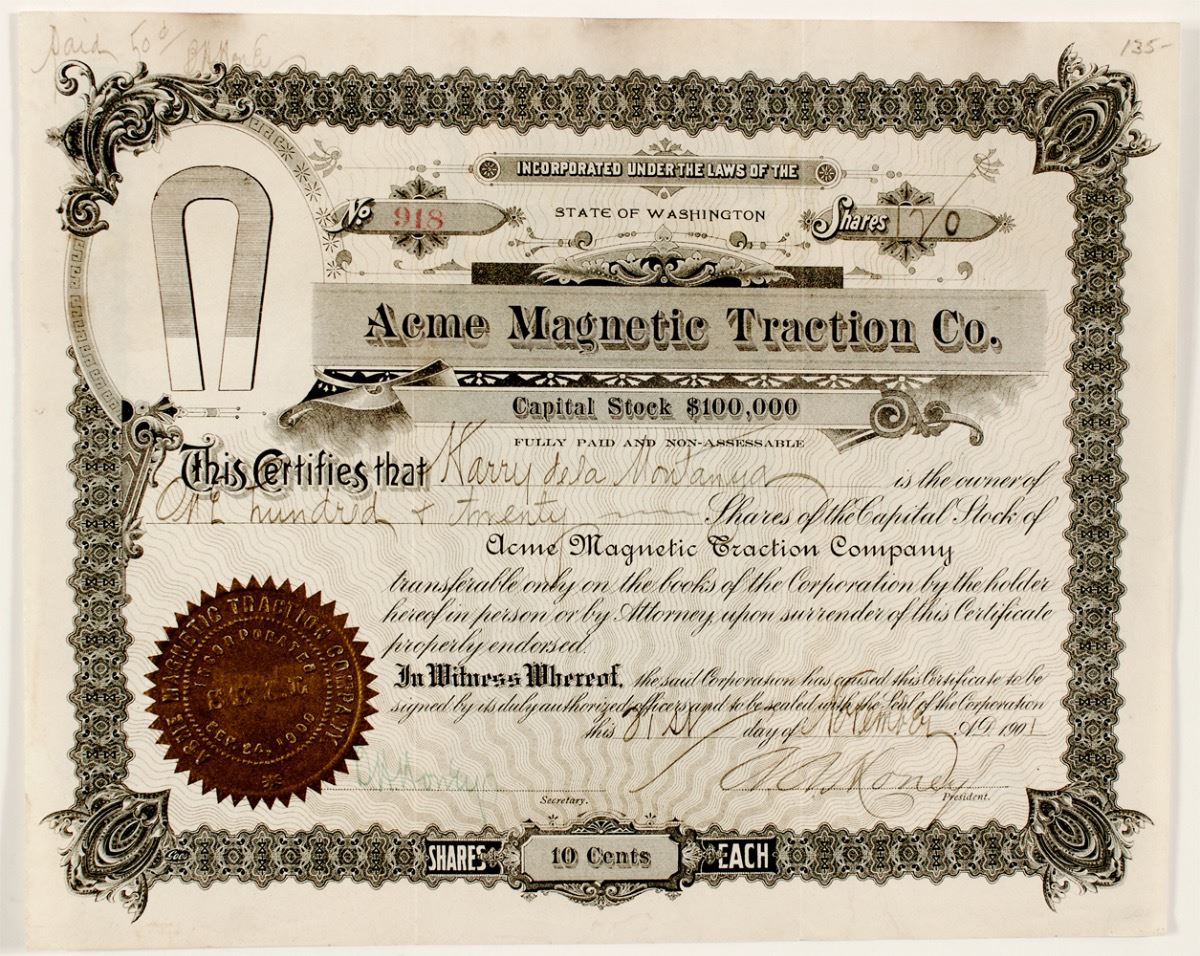 Inc. in Washington in 1900. No. 918. Issued for 120 shares to Harry de la Montanya on Nov. 21st, 1901. Orante border and vignette at upper left of magnet. Gold seal. Signed by corporate officers. According to the United States Investor, Vol. 14, "the company claims to have patents for a magnetic device on locomotives to prevent the slipping of the wheels, without the use of sand." Folds and soiling. Prag Collection City: Tacoma State: Washington Date: hwac# 22639