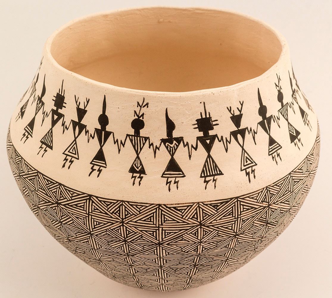 Acoma Pot by Corrine Lewis. Beautiful bowl with fine line detailing and figures around the rim. 6.5" h x 7" diameter. Excellent condition. Date: 2016 Location: Acoma Pueblo, New Mexico HWAC # 48867
