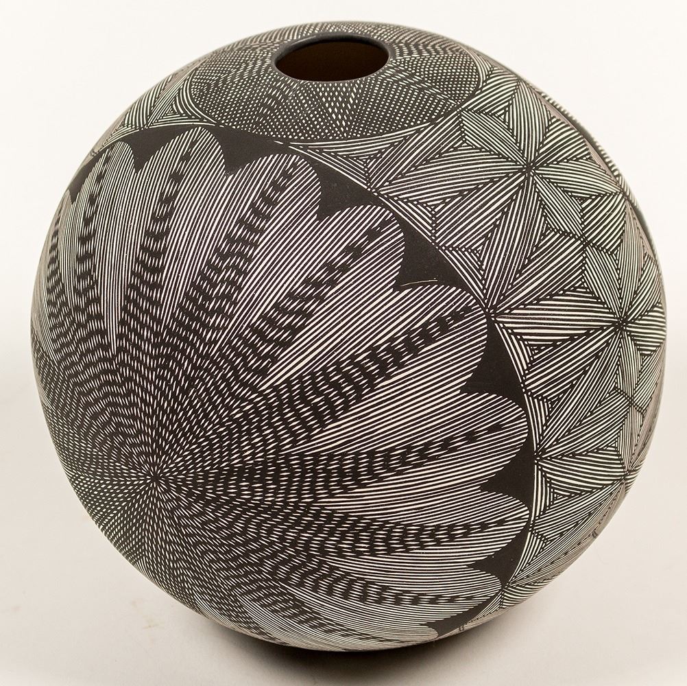 Beautiful mold made, fine line, hand painted seed pot from Acoma, signed "SV". 6" high x 6" diameter. Pot is in perfect condition.