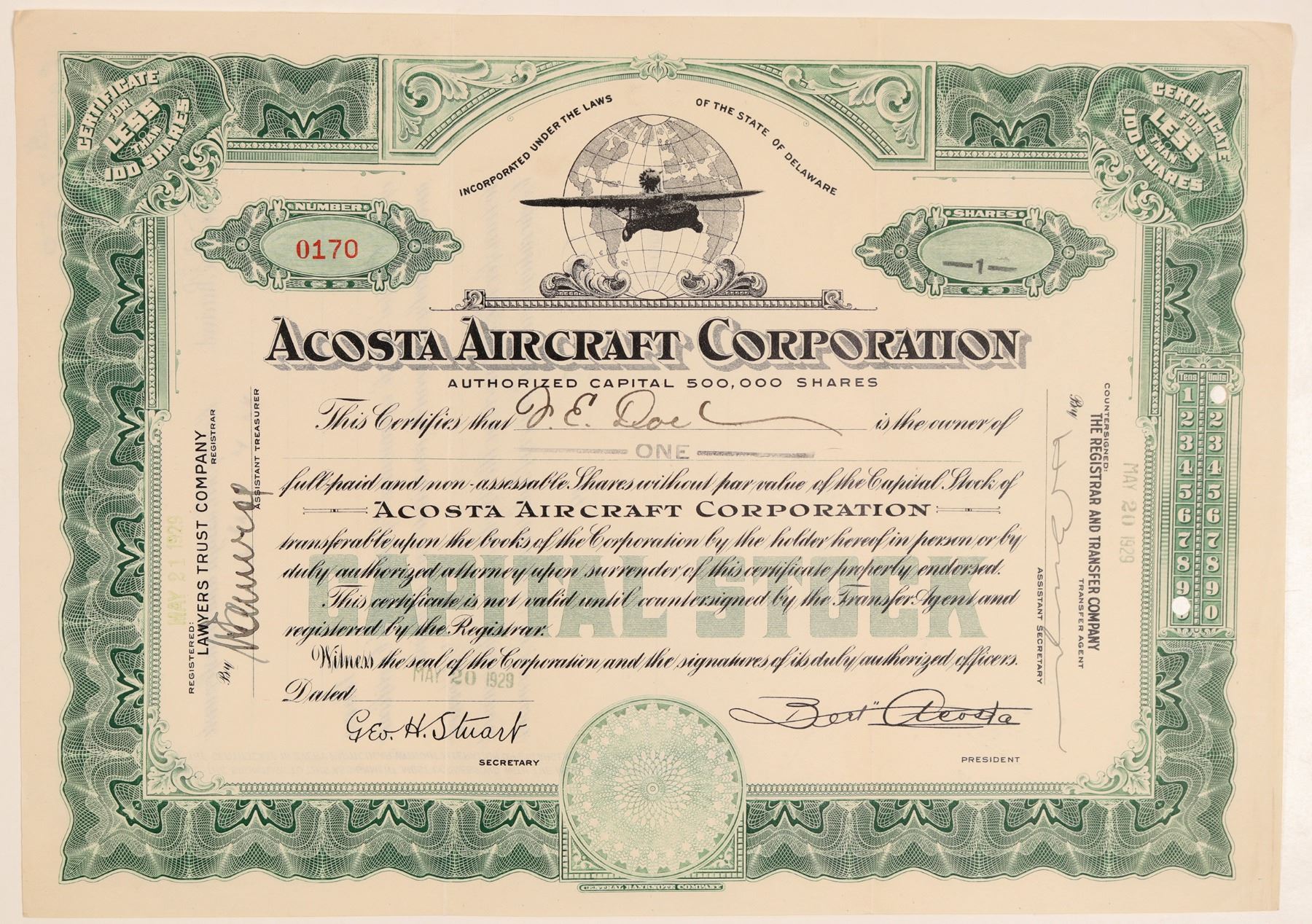 # 170 for 1 share to JE Doe. signed by Stuart and president Ben Acosta ( a great aviation signature!). Not cancelled. 1929. Vignette of an open cockpit airplane. Acosta was one of te first test pilots for open cockpit airplanes - flying one in New York in freezing conditions. Nice condition with a few small issues. Ben Acosta was a record-setting aviator. With Clarence D. Chamberlin they set an endurance record of 51 hours, 11 minutes, and 25 seconds in the air. He later flew in the Spanish Civil War in the Yankee Squadron. He was known as the "bad boy of the air". He received numerous fines and suspensions for flying stunts such as flying under bridges or flying too close to buildings. In 1929 Acosta tried to reinvent himself as an aviation consultant. He even founded the Acosta Aircraft Corporation, to manufacture a multipurpose amphibian, but the enterprise soon collapsed. Ken Prag Collection