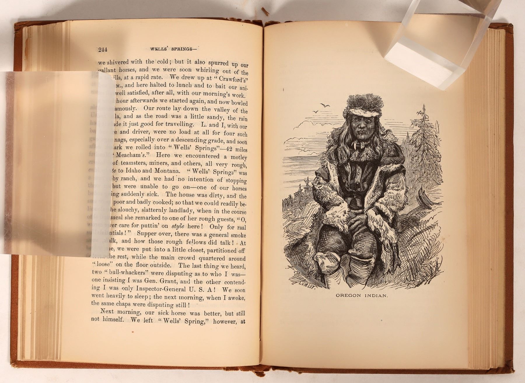Across America: or, The Great West and the Pacific Coast. James F. Rusling, Brevet Brigadier-General, U.S. V. First edition, 1875. Signed by author. Rusling gives his account of his adventures in 1866 after being given orders to carry out a tour of inspection of all posts from Kansas through Denver City, Salt Lake City and to the Pacific Coast. Then embark upon an inspection tour of California, Oregon, Nevada, and Washington and Arizona territories. 503 pp. 5" x 8". Has map. Upper/lower spine wear, corner bumps, otherwise good.