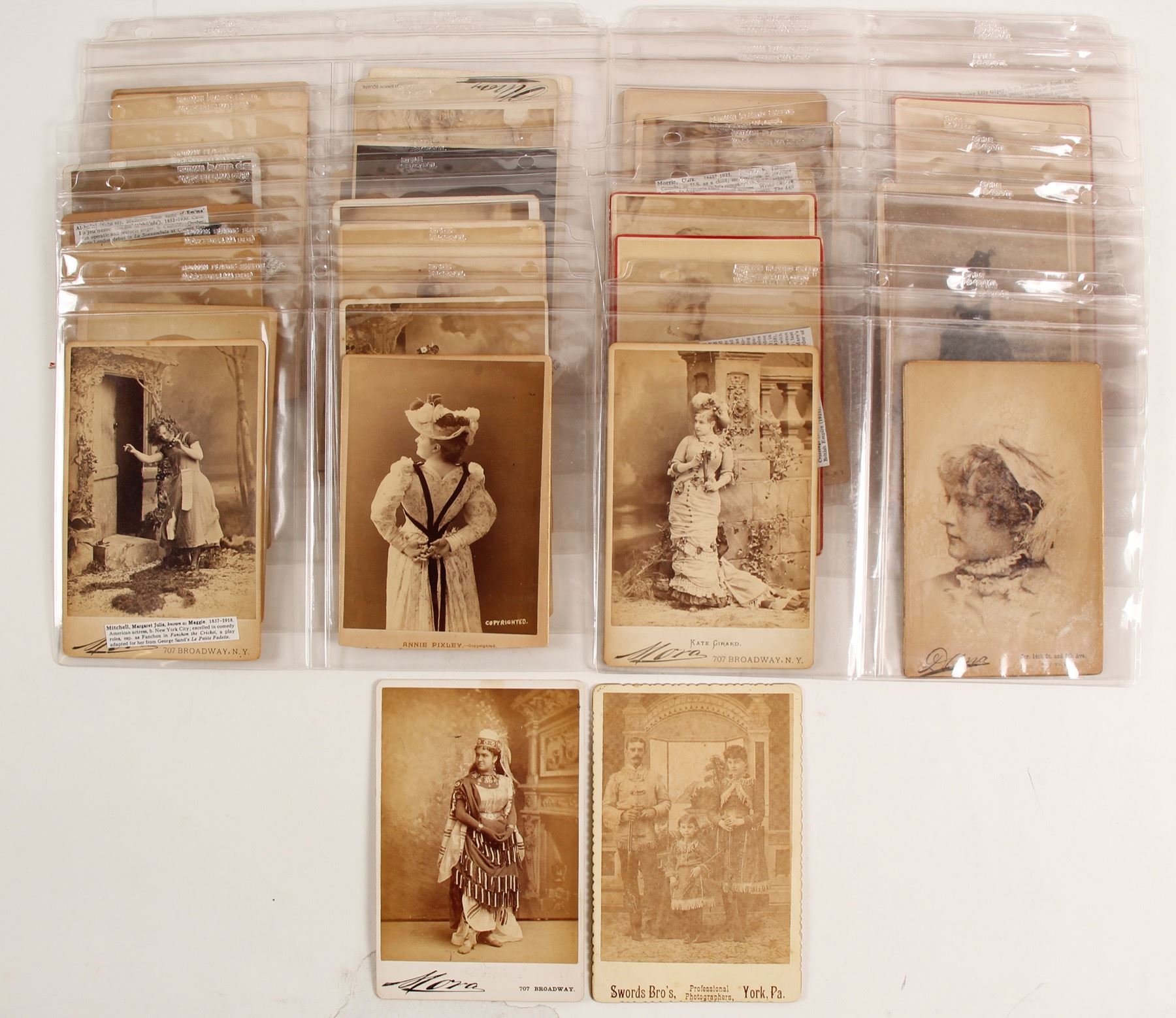 Approx 27 5.5x4" mounted photos of actress' and actors related to NY theatres of the era. Many shot by Mora, NYC. Maggie Mitchell, Toriani, Annie Pixley, Etelka Gerster, Agusta Raymond, Lizzie Harold, Albani, Adelaide Ristori, B. Heron, Clara Morris, Margaret Mather, Marie Roze, Kate Girard, Julia Wilson?, Ellen Terry, Marie Jansen, G. Ward, Sadie MMartinat, Sarah Jewett, Fanny Gipsy and other unidentified. Nice condition overall. Mackie Collection
