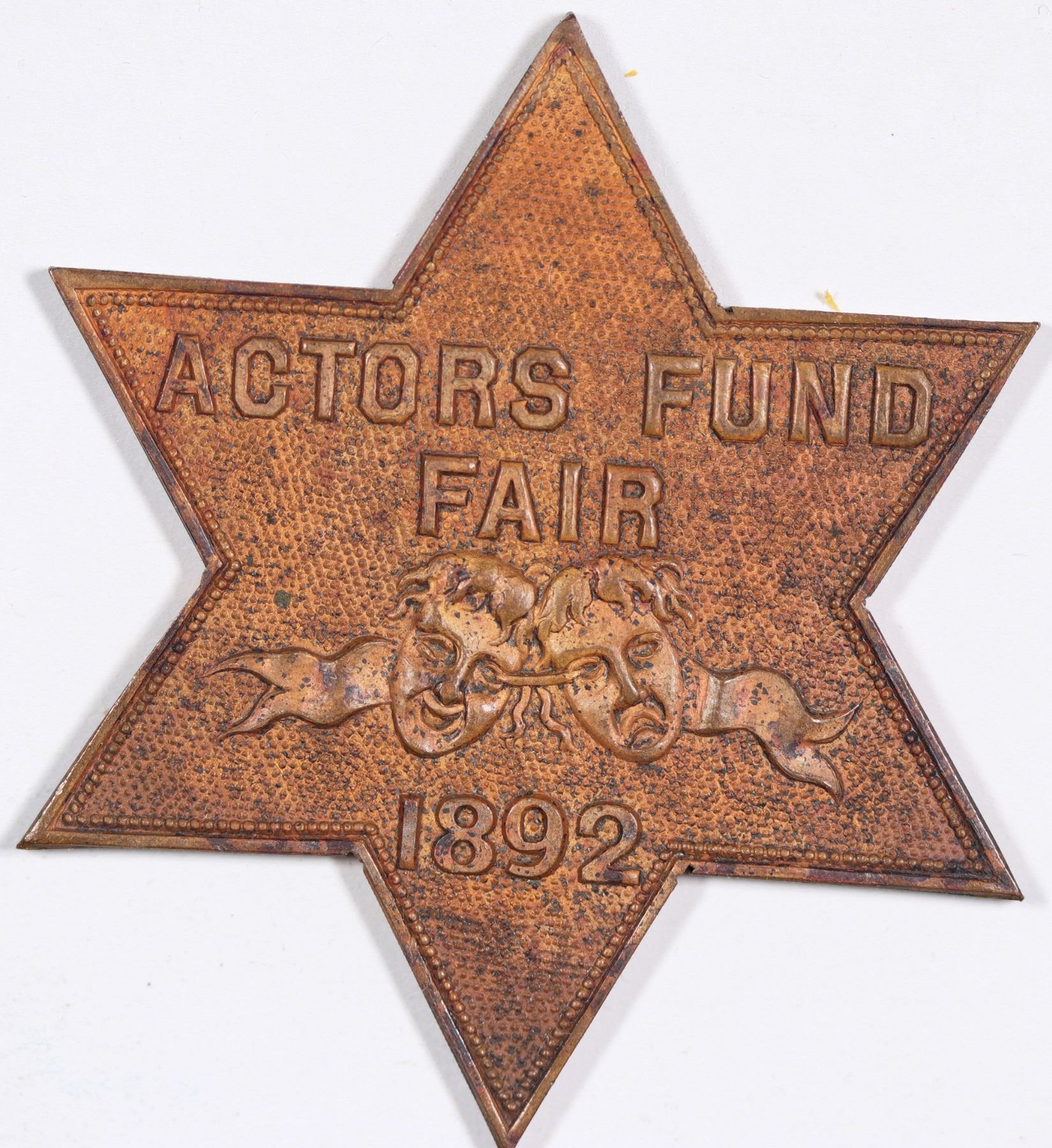 Six point bronze star from the Actors Fund Fair of 1892, 52 mm. Rare. The first Actors Fund home on Staten Island was dedicated in 1902. This was made possible in part by the successful 1892 Fair held at Madison Square Garden, which raised over $163,000. This was the first time that the profession was overwhelmingly accepted by society. In attendance were President and Mrs. Grover Cleveland, Mr. and Mrs. John Jacob Astor, Andrew Carnegie, J. Pierpont Morgan and Cornelius Vanderbilt.