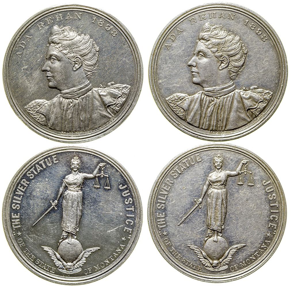 Obv.: Ada Rehan / 1893 / portrait; Rev.: The Silver Statue Justice / of the state of Montana / (pictorial); 45mm, aluminum, R6. Two pieces. Irish born actress Ada Crehan (1860-1916) was known for Shakespearean roles, a misprint in a program had her name as Ada Rehan and she adopted the stage name. These medals are likely part of the 1893 World's Columbian Exposition. Ada Rehan was the model for the statue that was in the Montana Building at that Chicago World's Fair. (Svoboda Collection)