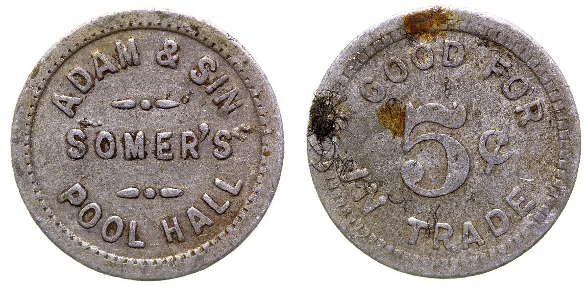 R- 9. Adam & Son / Somer's / Pool Hall // GF 5c / IT. Aluminum, round, 19mm. (Svoboda Collection) City: Somers State: Montana Date: HWAC# 35011