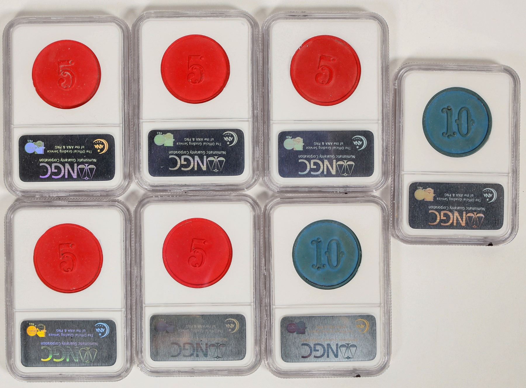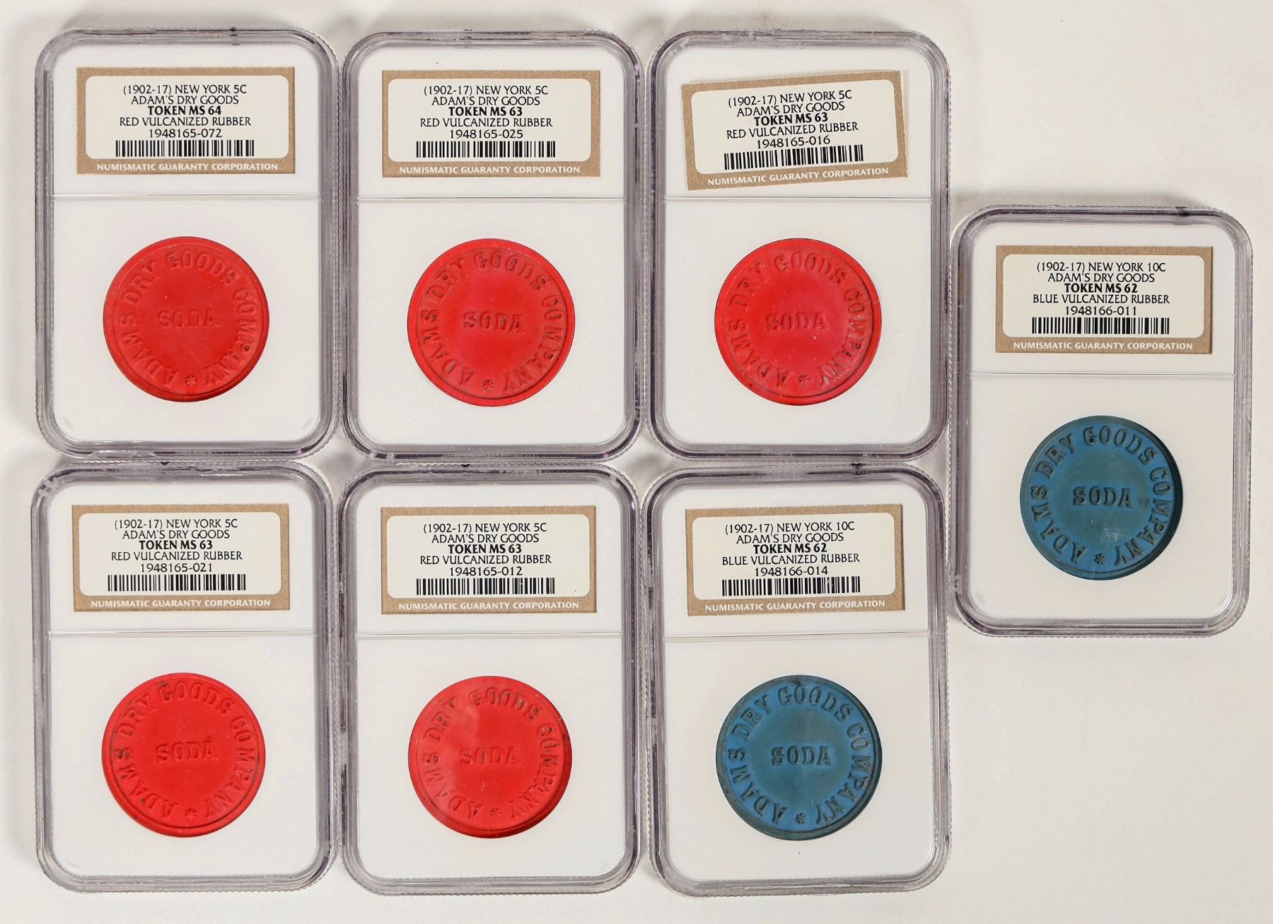 Seven NGC graded vulcanized rubber tokens from Adam's Dry Goods, circa 1890s. Two are blue; good for 10c, both MS 62. Five are red, good for 5c; four MS 63, one MS 64. In the early 20th century, Adam's Dry Goods operated in New York City on Sixth Avenue, as part of the retail landscape known as Ladies' Mile. The store was known for its elegant design and display windows, even including ones for riders on the elevated train. The store ultimately closed in 1913.