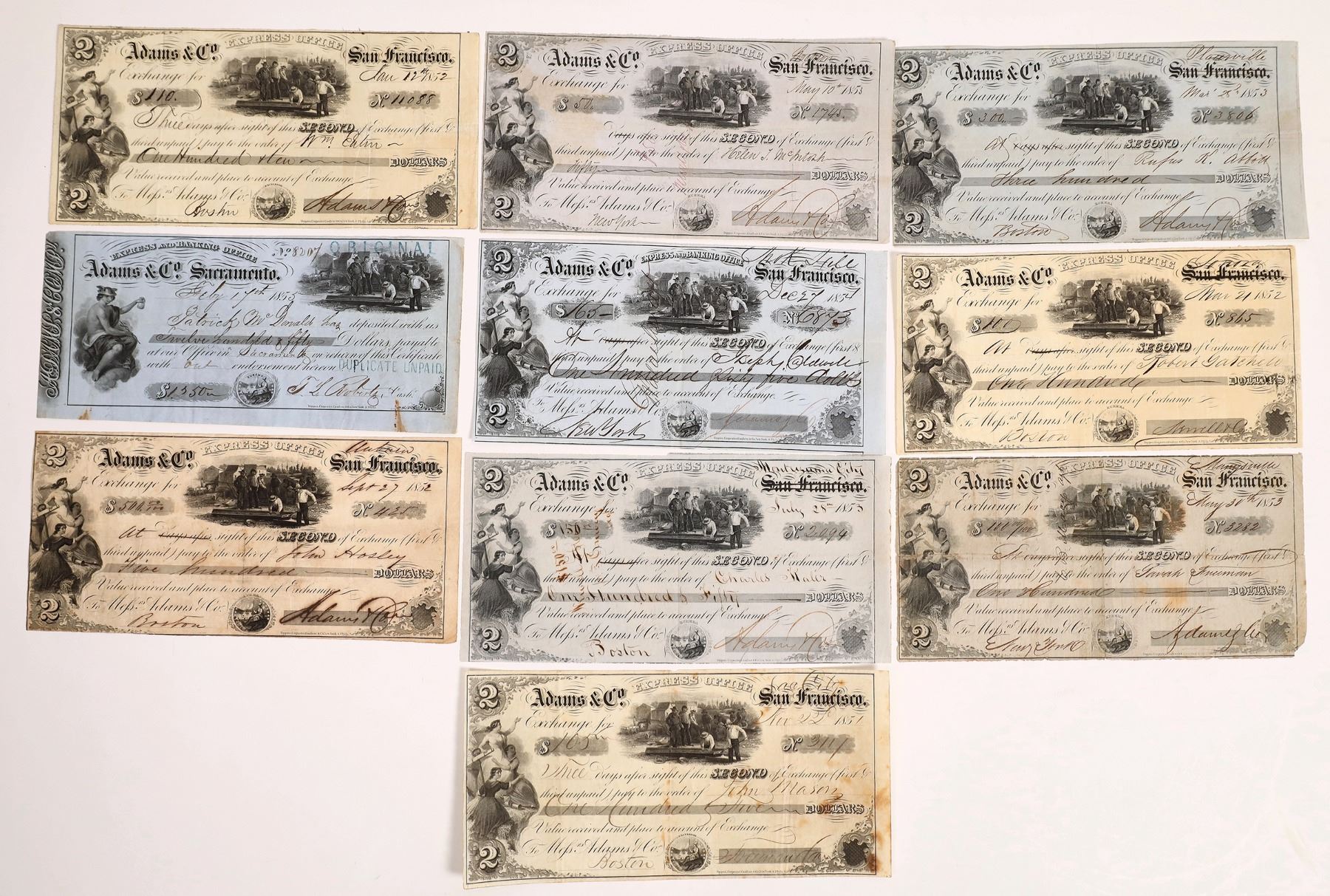 Collection of 10 exchange notes from Adams & Co. They are from major California Gold Rush towns including Sacramento (1851 and 1855), Marysville (1853), Sonora (1852), Placerville (1853), Montezuma City (1853), Mokelumne Hill (1854), Stockton (1853), Auburn (1852), and San Francisco (1852). These exchange notes show how Adams & Co. got into the major Gold Rush towns to become a competitor to Wells Fargo & Co. These note all have a very nice vignette of gold miners cleaning out a sluice box. Good condition.