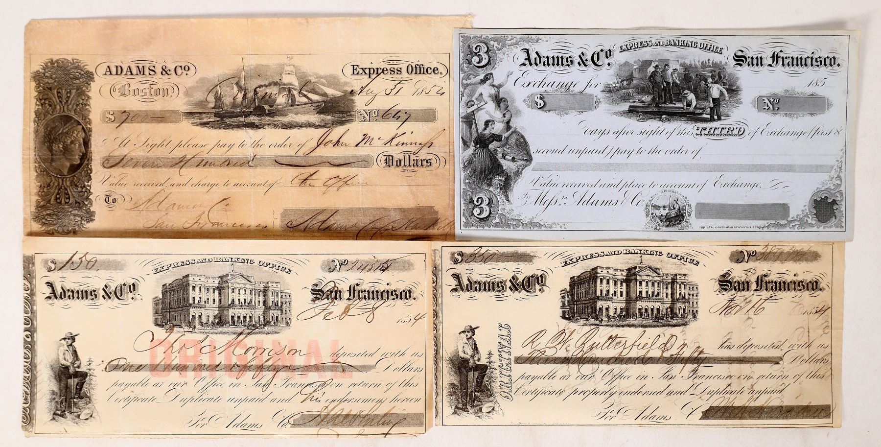 4 Adams and Co. Express c. 1854 checks. 1 is issued to H W Butterfield. Is he related to John Butterfield of American Express? San Francisco California