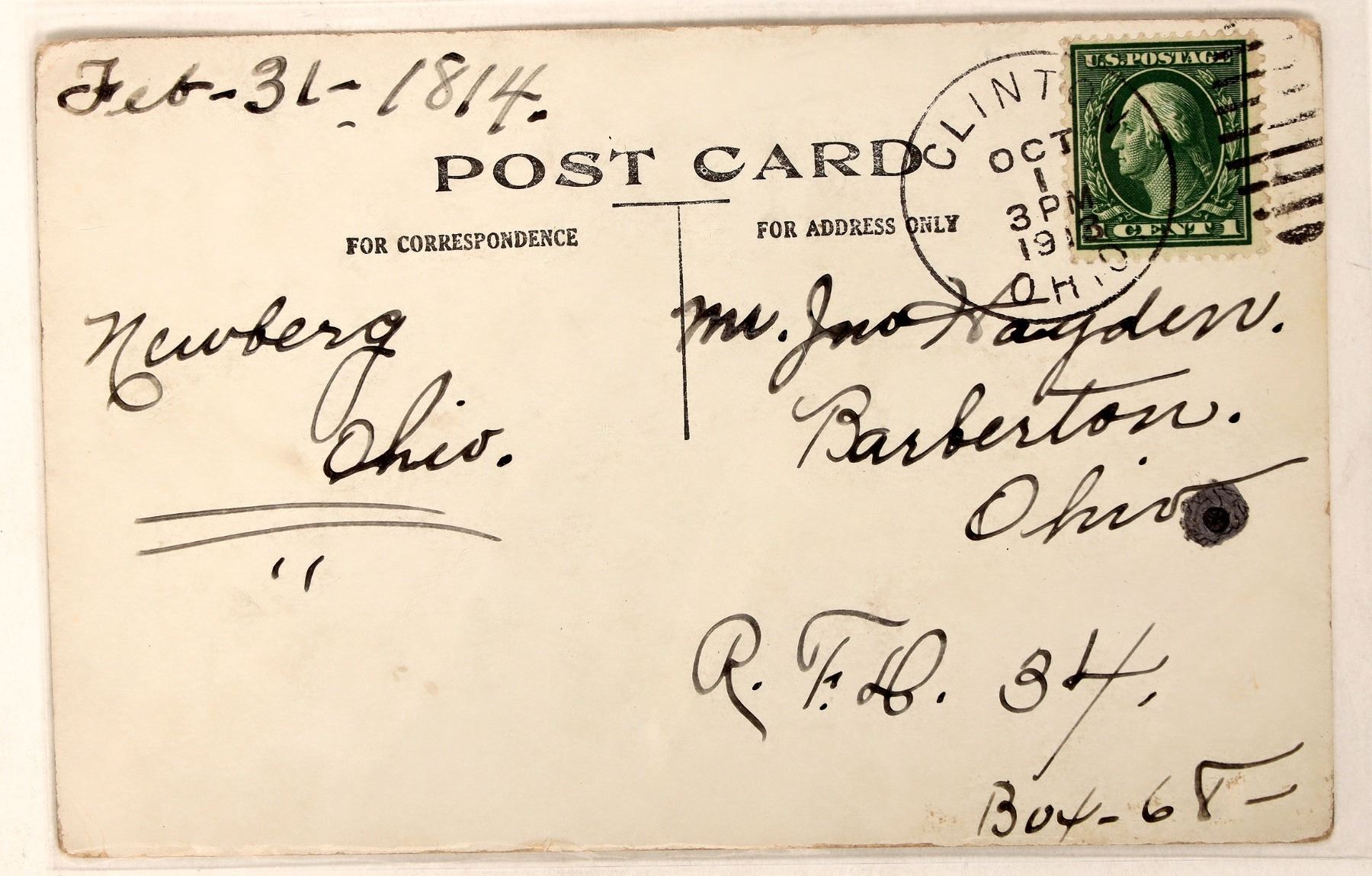 Manchester pennant postcard with 1913 Clinton, Ohio in Summit County postmark. This is the only Adams county card in this very large collection.[ Adams County Ohio