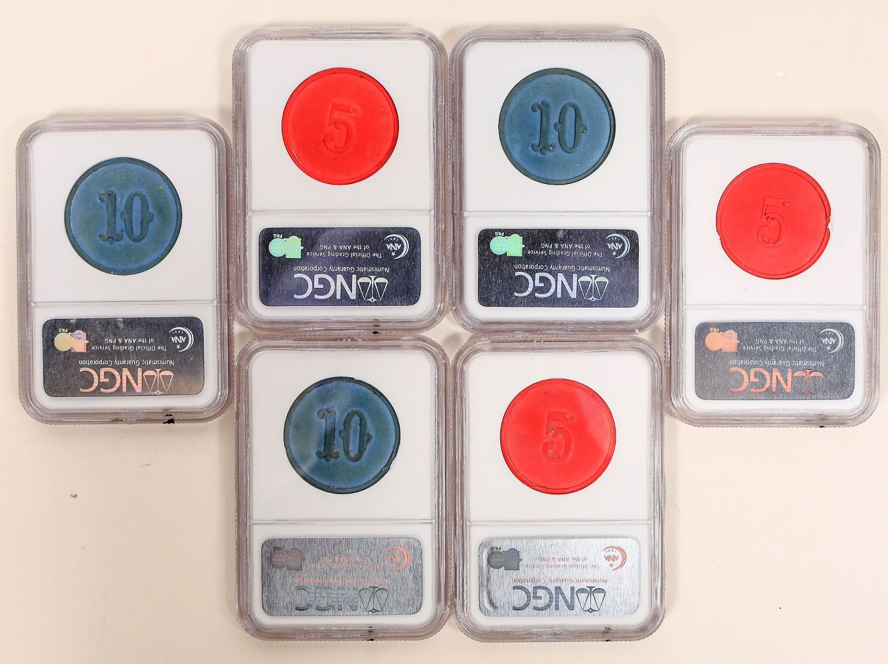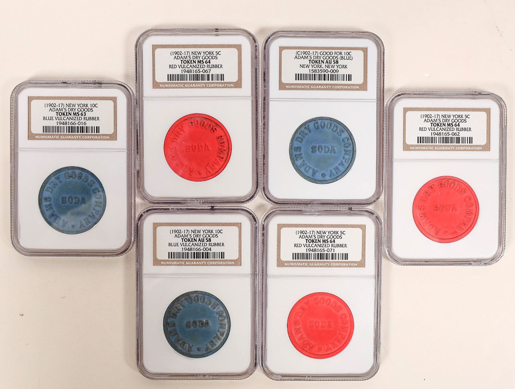 Lot of six highly graded tokens from Adams Dry Goods of New York City's "Ladies Mile." Three are red vulcanized rubber, good for 5c, all graded MS 64 by NGC. Three are blue vulcanized rubber, good for 10c, one graded MS 63, two AU 58. Samuel Adams emigrated from Canada to the Colorado silver rush, then to New York City in 1885. By 1900, he had built 675 Sixth Avenue: a six-story Beaux Arts structure of cast iron and masonry, with four giant limestone columns on its facade and a magnificent interior courtyard extending to a skylight at roof level. The ground floor is now home to Trader Joe's.
