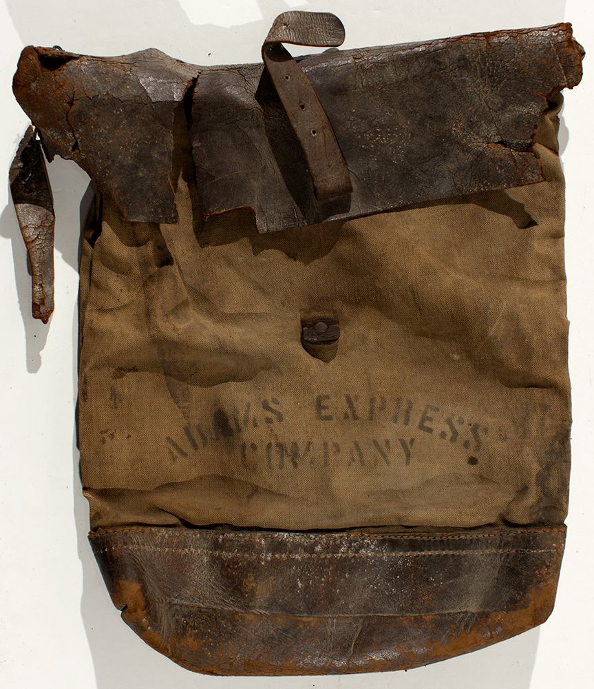 Non-locking. Canvas. Stamped: "Adams Express Company." 12.5' x 12.5" Heavily used: leather ripped and brittle, stain to canvas. Original finish wearing off. (Ex-Parker Lyon Pony Express Museum)