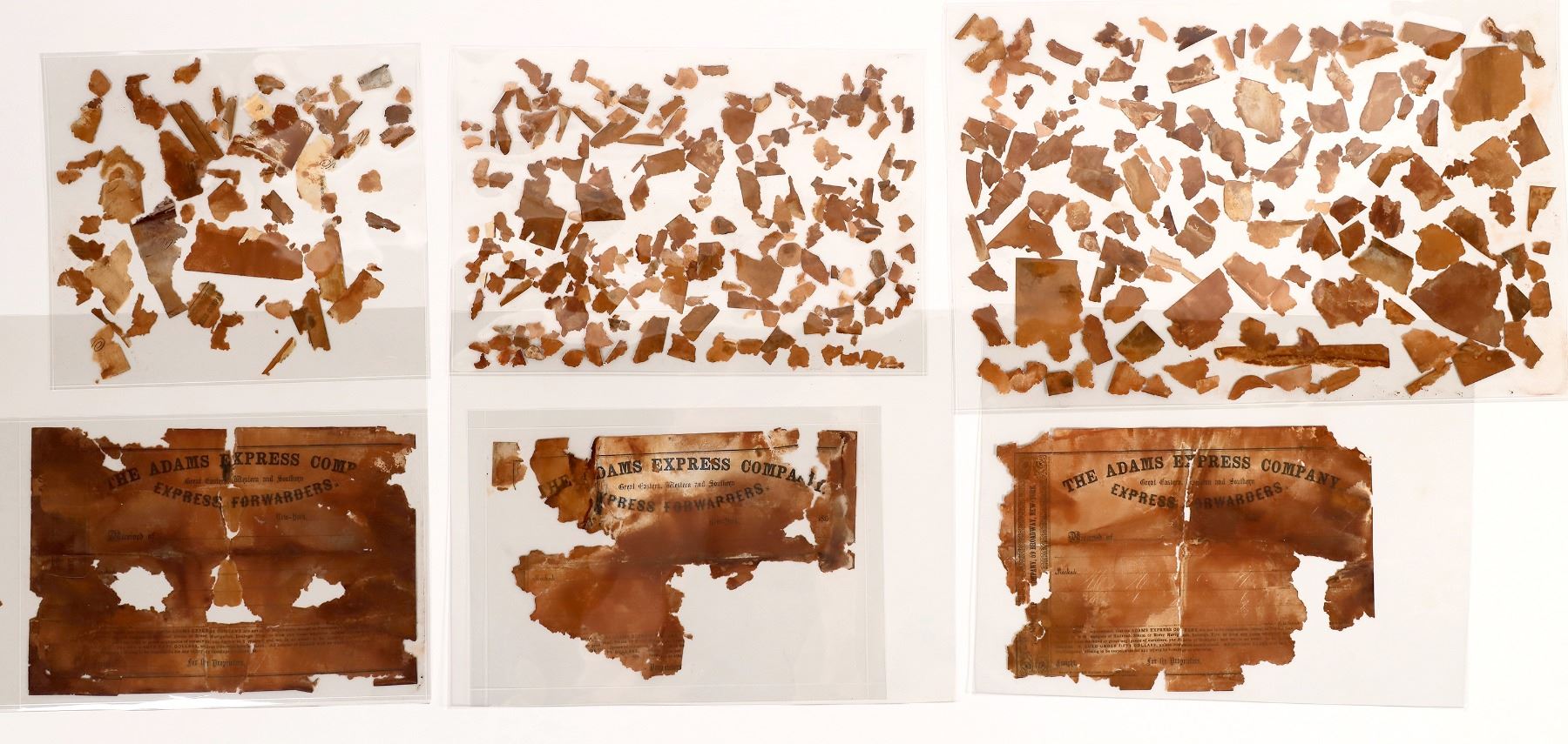 Three partial Adams Express shipping receipts plus partial of another, as conserved by the Northeast Document Conservation Service in Andover, Mass. These documents were among the document group recovered from the purser's safe in 2014. These documents would have specified items shipped on the SSCA. While one document is dated 1857, the month is obscured. I New York, Adams Express was a competitor to Wells, Fargo & Co.'s Express. The Adams Express branches in California went broke in 1855, and though the forms state "Great eastern, western and southern Express forwarders", they would have had to contract with a western express to get these goods to California, if that is where they were headed (that information is also obscured.) Other than the Wells Fargo Express treasure box lid and Dement's checkbook for the Wells Fargo Bank, no other express documents were recovered form the SSCA.