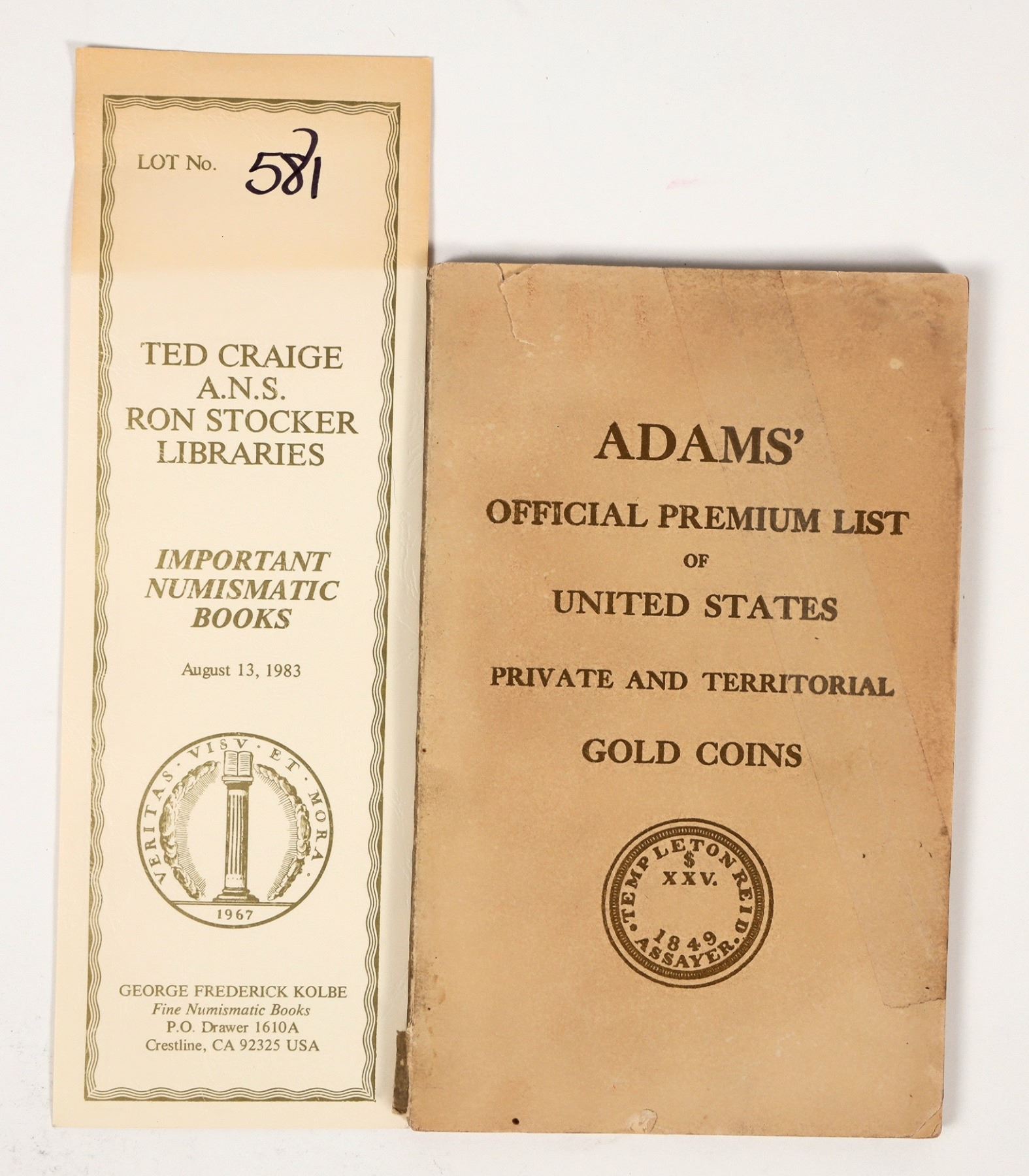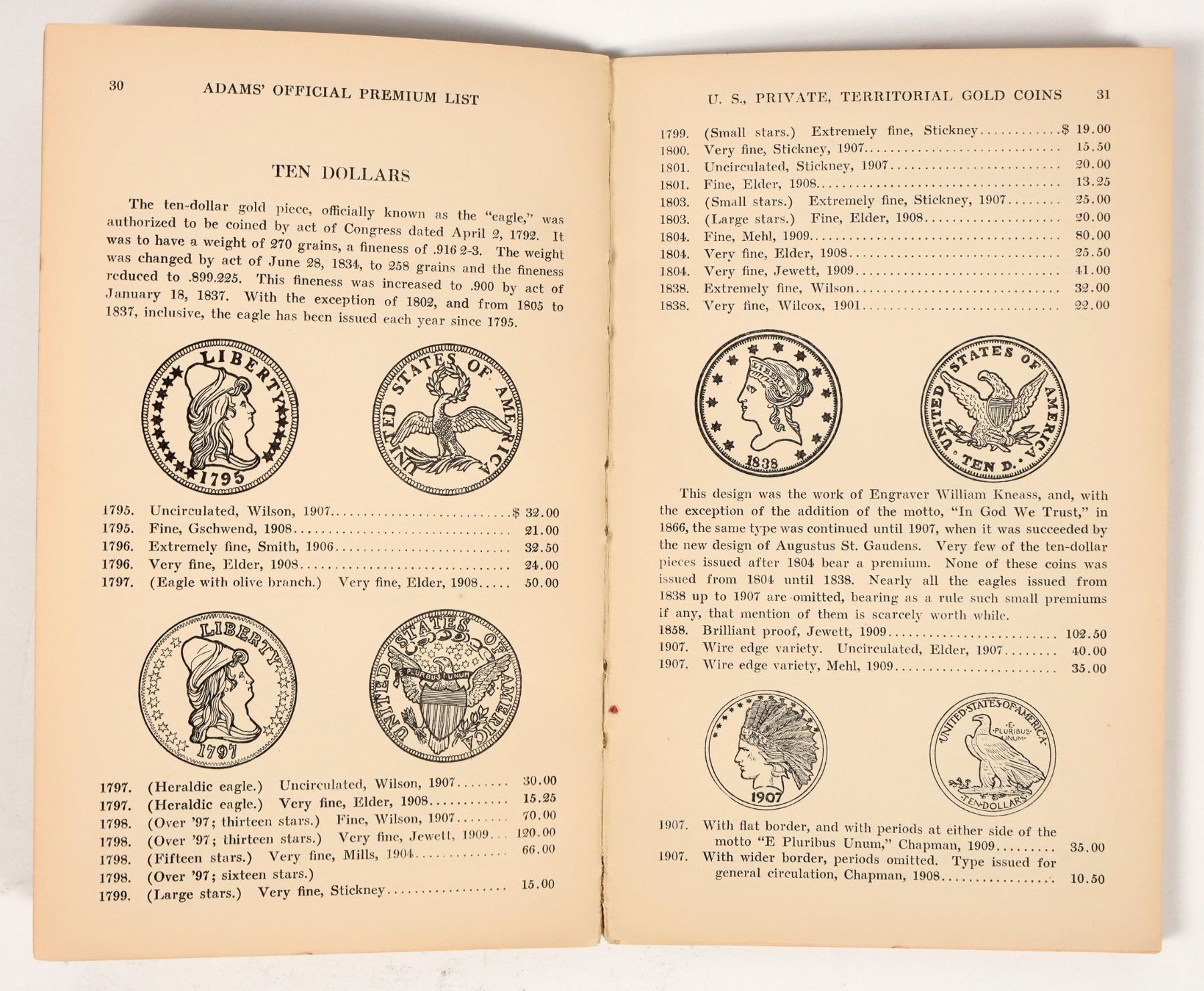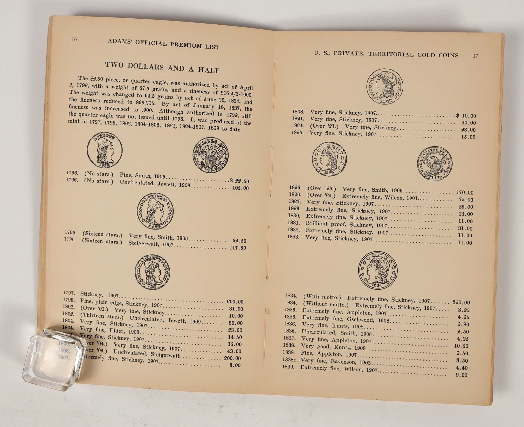 Published by Edgar H. Adams in 1909, a 72 page soft cover booklet of the Official Premium List of United States private and territorial gold coins indicated by prices brought at public coin sales. Previously Lot 581 in George Frederick Kolbe's auction of August 13, 1983. Rare.