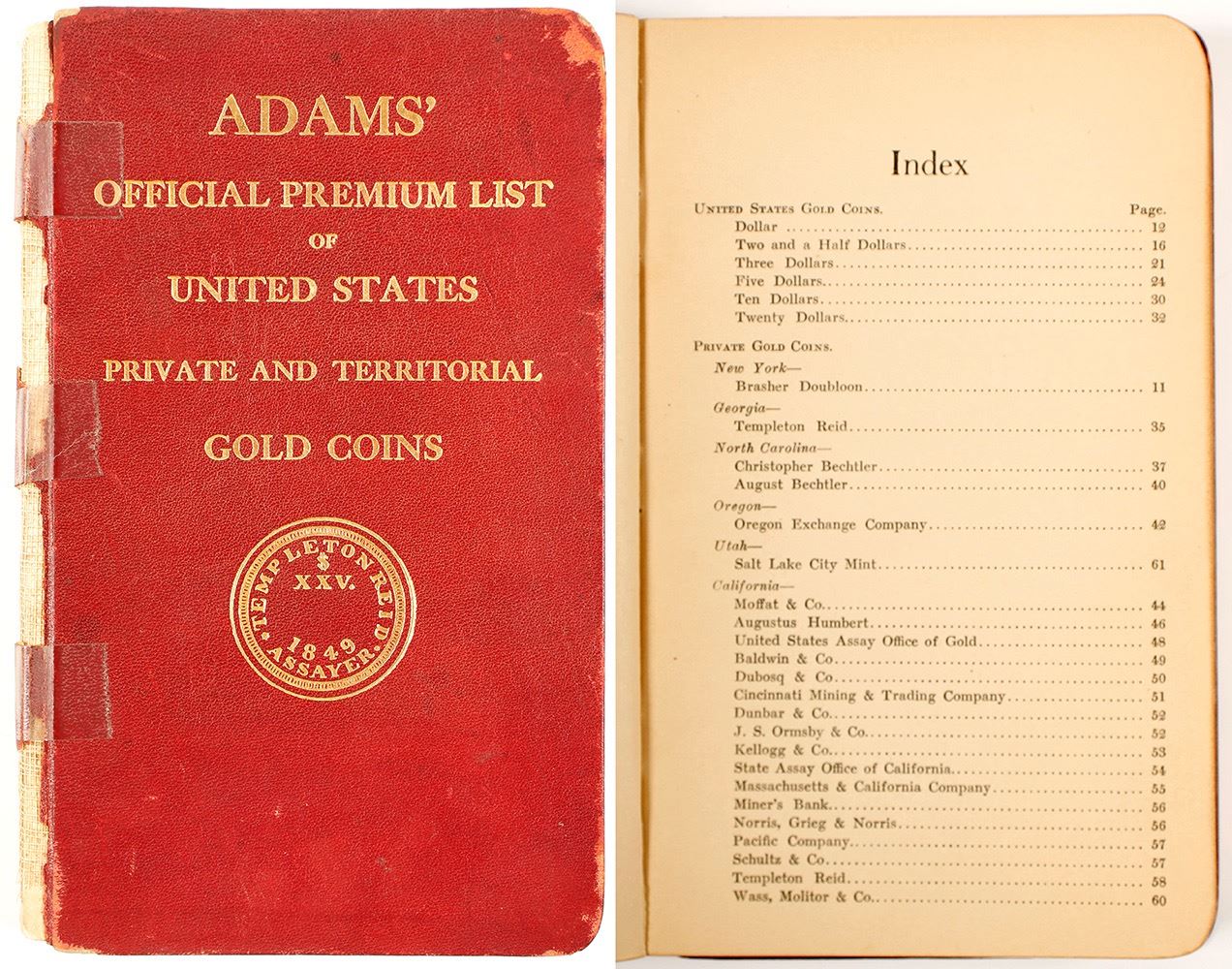 Edgar Holmes Adams published this volume on territorial and private gold at the beginning of the 20th century. Private gold coins were issued in Georgia, North Carolina, Utah, Oregon, California and Colorado. Hardback (binding repaired), 72 pages. Previously owned by e.A. Parker numismatist of 1122 Market Street, San Francisco. A rare volume. HWAC# 61618 Date: 1909 Location: