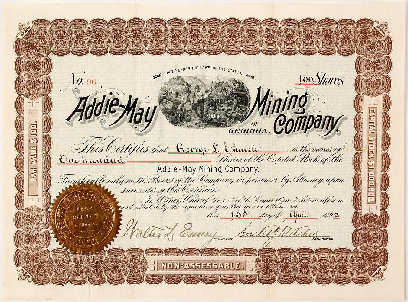 This is the earliest and best of the two stocks for sale in this auction. Number 96 for 100 shares to George L Church in 1892. Signed by president Walter L Emery and treasurer Fletcher. The outdoors hard rock mining vignette is rather unusual. Two vertical folds and the upper left corner is dog eared. 12 x 9". Mine was located in New England City in Dade County, Georgia. Dade County is in the far northwest corner of Georgia. This mine or mining district is not named in Yeates. New England City was one of any number of similar post-War developments in the South, conceived by northern investors attracted to its natural resources and abundance of cheap land and labor. The New England Company was chartered by the State of Georgia in November 1888. Its board was dominated by northern men and money, including former Vermont Governor Roswell Farnham, nine other investors from Boston and New Hampshire, and but two from the South, one of them Thomas Lumpkin of Trenton, the Dade County seat. The Company’s lands consisted of “10,000 acres of iron ore lands, 6,000 acres of coal lands and 1,400 acres for a city site.” The city was incorporated in 1890. Although gold would have been a by-product of the coal and iron mines the Addie-May seems to have been primarily a gold mine. The 1897 "Mine, Quarry, and Metallurgical Record" lists two mines in Dade County. The New England Company is listed as an iron mine and the Addie-May as a gold mine. (Al Adams Gold Rush Memorabilia Collection) Date: 1892 Location: New England City, Georgia HWAC# 57023