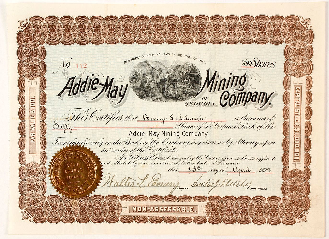 Number 112 for 50 shares to George L Church in 1892. Signed by president Walter L Emery and treasurer Fletcher. The outdoors hard rock mining vignette is rather unusual. Some light folds on bottom left. 12 x 9". Mine was located in New England City in Dade County, Georgia. Dade County is in the far northwest corner of Georgia. This mine or mining district is not named in Yeates. New England City was one of any number of similar post-War developments in the South, conceived by northern investors attracted to its natural resources and abundance of cheap land and labor. The New England Company was chartered by the State of Georgia in November 1888. Its board was dominated by northern men and money, including former Vermont Governor Roswell Farnham, nine other investors from Boston and New Hampshire, and but two from the South, one of them Thomas Lumpkin of Trenton, the Dade County seat. The Company’s lands consisted of “10,000 acres of iron ore lands, 6,000 acres of coal lands and 1,400 acres for a city site.” The city was incorporated in 1890. Although gold would have been a by-product of the coal and iron mines the Addie-May seems to have been primarily a gold mine. The 1897 "Mine, Quarry, and Metallurgical Record" lists two mines in Dade County. The New England Company is listed as an iron mine and the Addie-May as a gold mine.