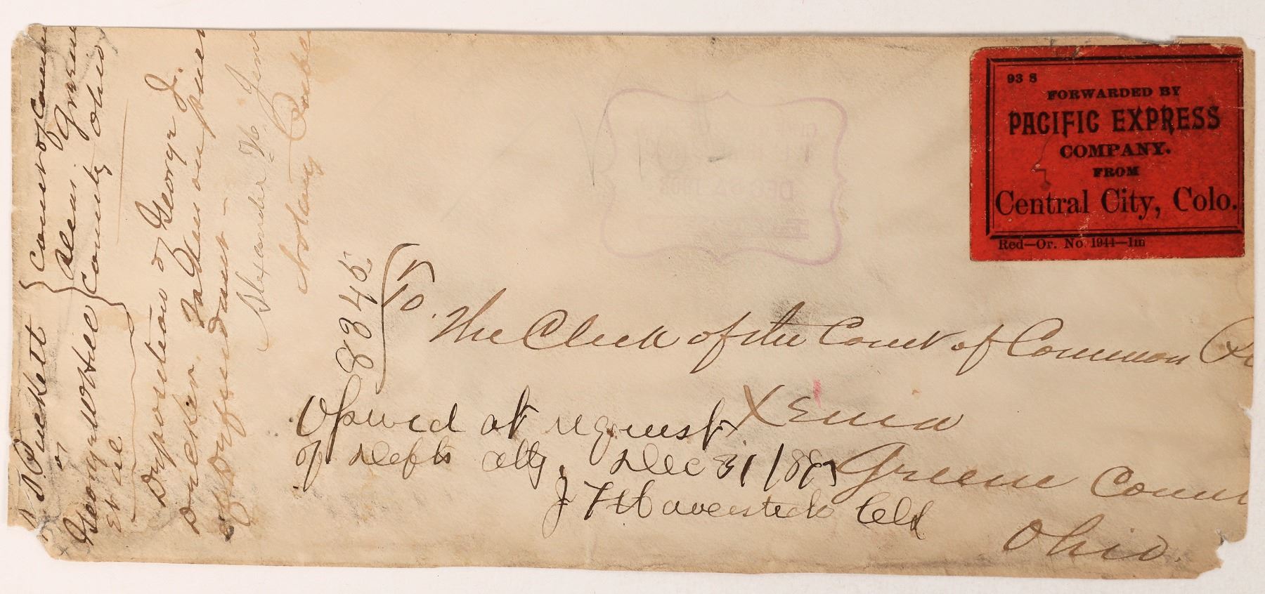 Red adhesive label "forwarded by Pacific Express Company from Central City, Colo." Front cover only. Addressed to Ohio.