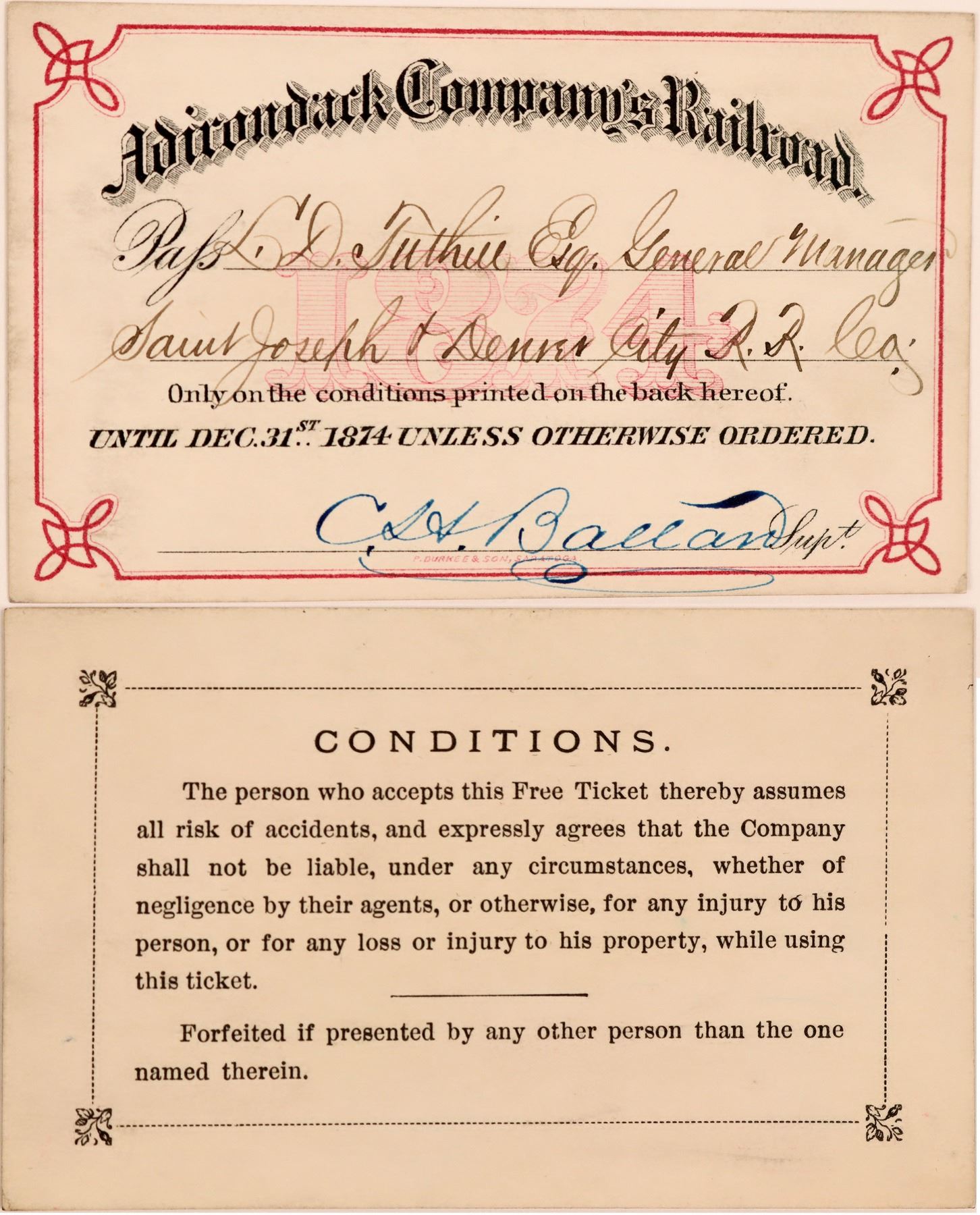 Issued to LD Tuthill Esq., General Manager for the Saint Jospeh & Denver City Railroad Company. Signed by superintendent CH Ballan. Red border with black print and red undeprint. Reverse has the company's Conditions. Pass is very clean. This railroad, completed in 1871, connected Saratoga Springs to North Creek, New York, a distance of 62 miles.