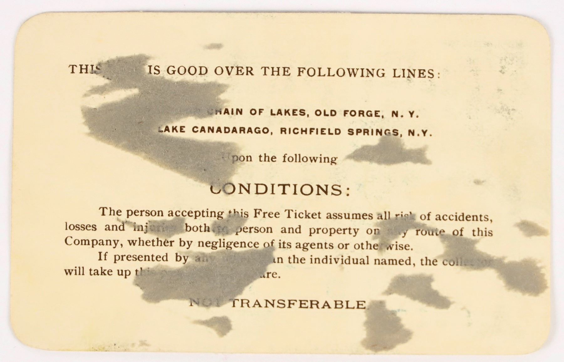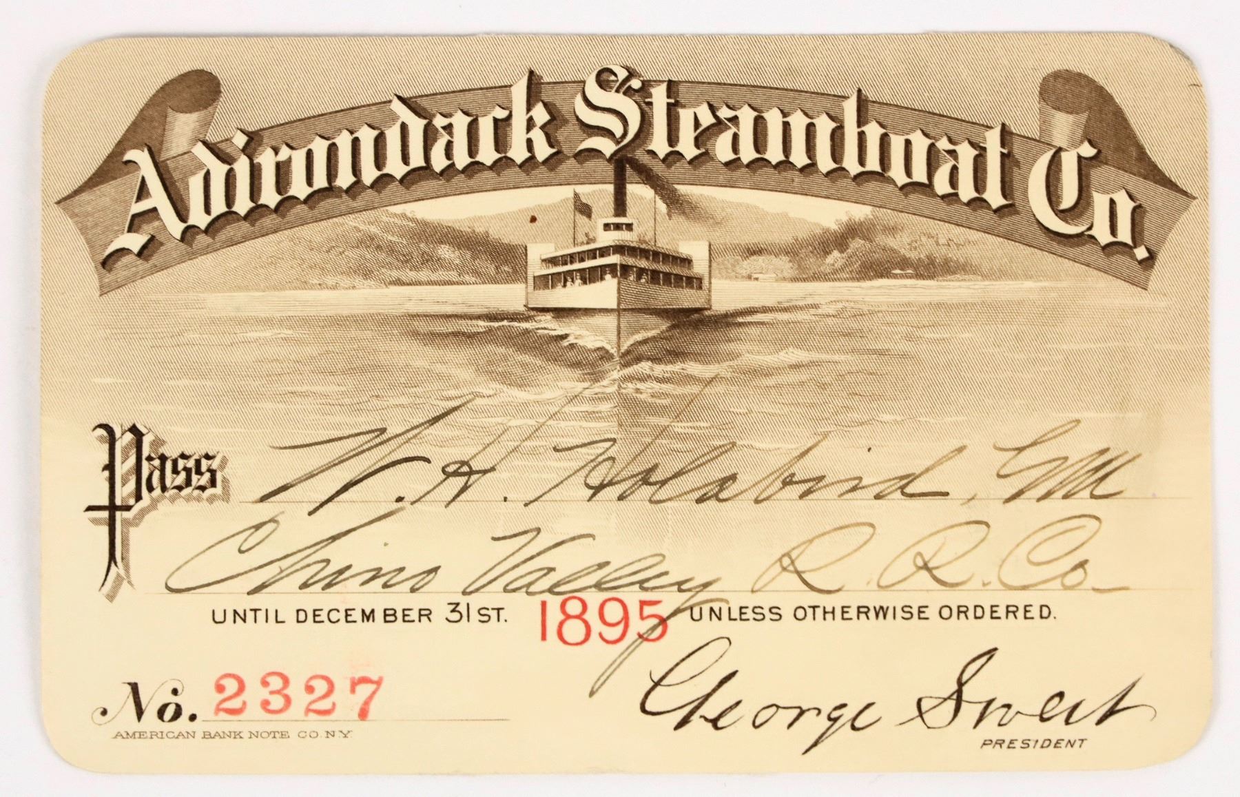 Pass for 1895 issued to WH Holabird (Fred's great grandfather) of the Chino Valley RR. Preprinted signature of president George Sweet. Brown background and vignette of steamship faced head-on. Printed on cardstock by ABN. Some paper residue on reverse. Reverse states it is good for travel over the following lines: Fulton Chain of Lakes, Old Forge, NY; and on Lake Canadarago, Richfield Springs, NY. WH Holabird would acquire distressed railroads for Southern Pacific. He was also a financier for Western resort hotels (like Hotel del Coronado).