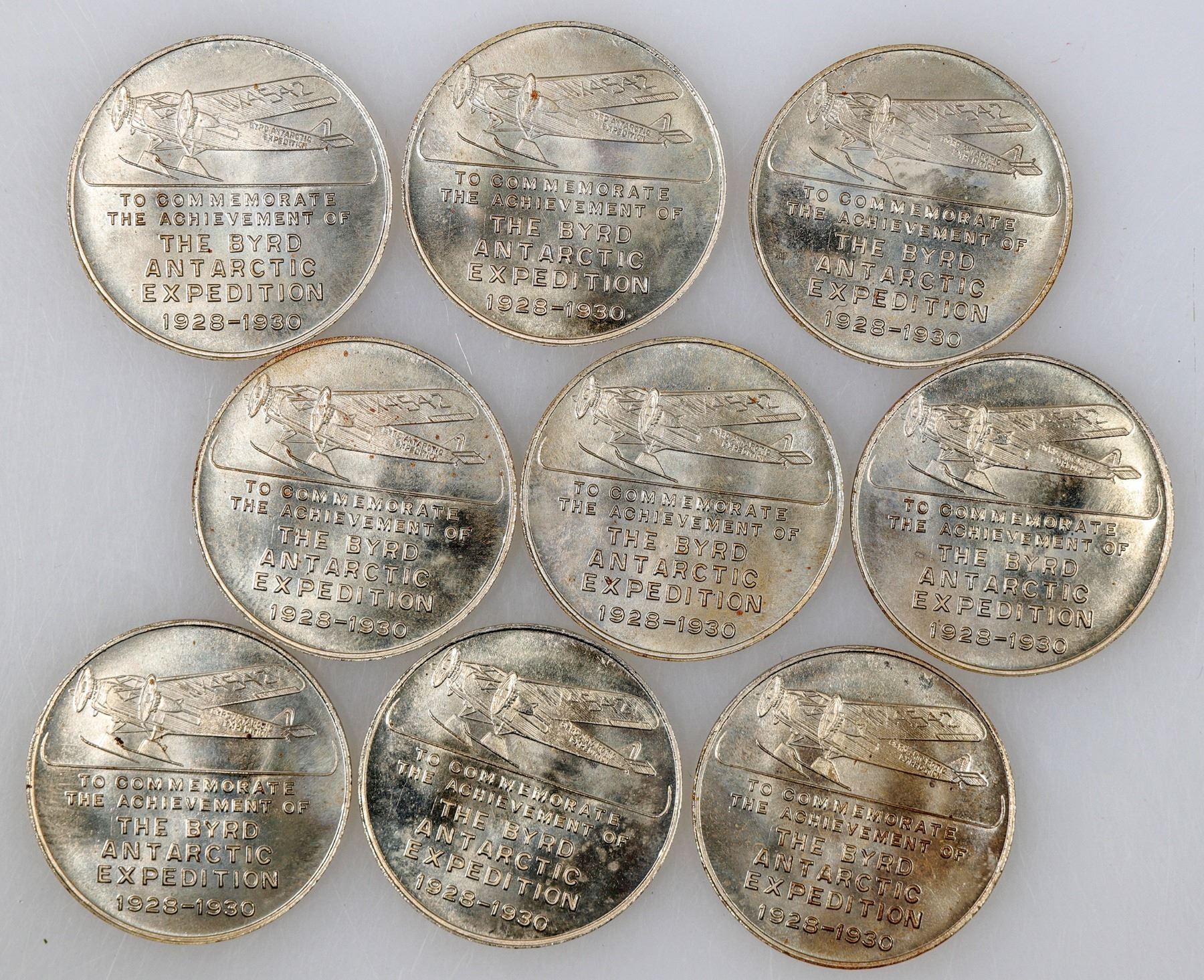 Lot of nine brilliant uncirculated medals celebrating Byrd's Antarctic Expedition. Obv.: First To Fly Over The South Pole / Rear Admiral Richard E. Byrd. U. S. N./ (bust facing left); Rev.: To Commemorate / The Achievement Of / The Byrd / Antarctic / Expedition / 1928-1930. WM, rd., 32 mm.