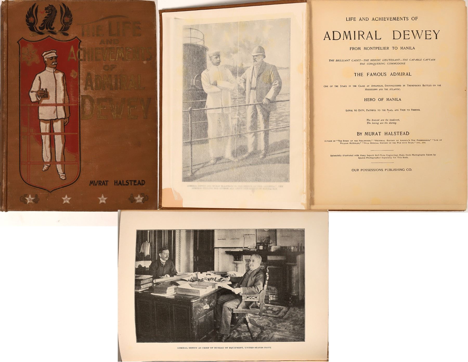 Hardbound book titled The Life and Achievements of Admiral Dewey (from Montpelier to Manila). By Murat Halstead. Includes many half-tone engravings made from photographs. Our Possessions Publishing Co. Copyrighted 1899 by H.L. Barber, Chicago, IL. 452 pgs. Covers & binding intact. Good condition.