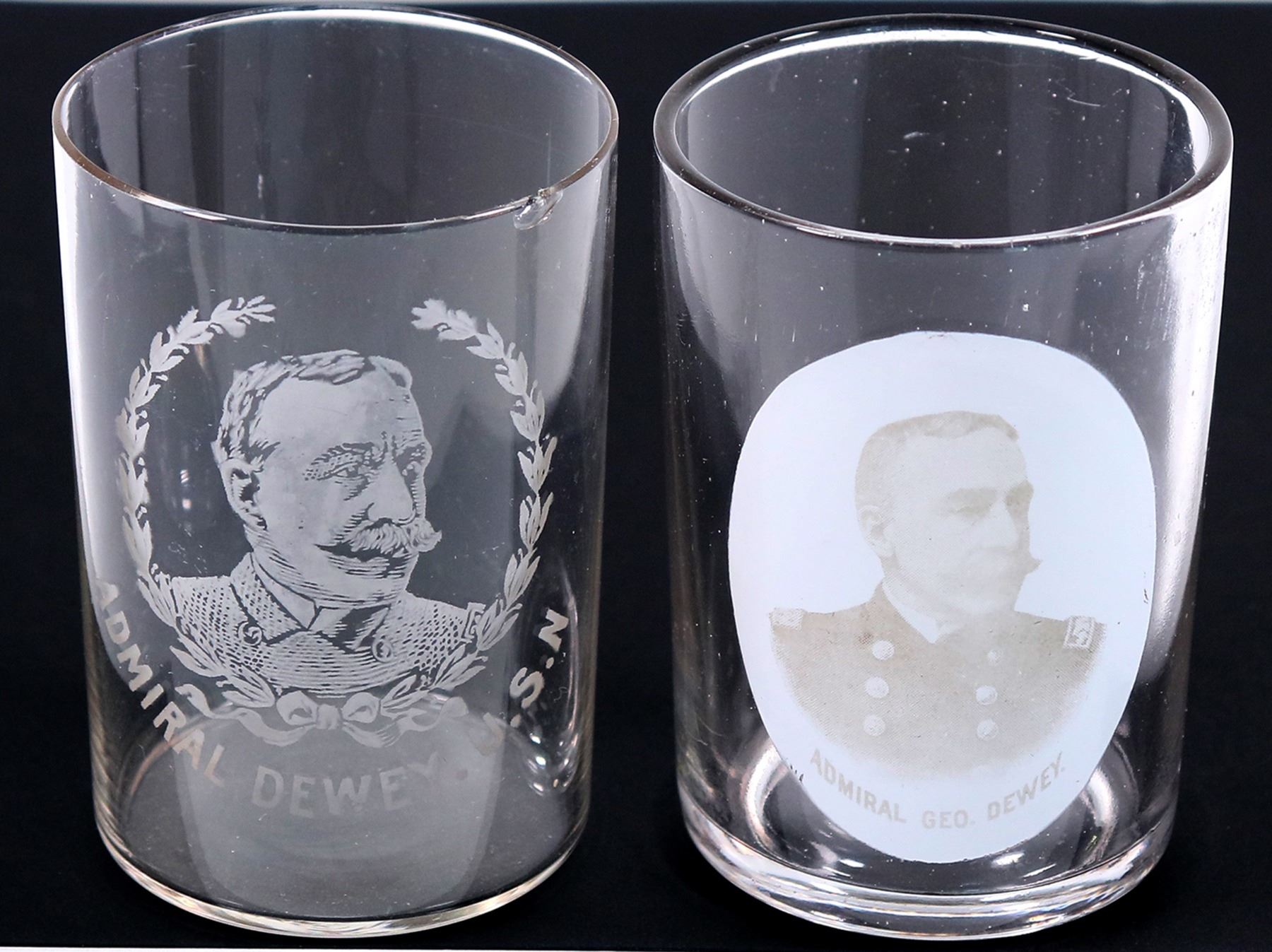 Thin wall glass Admiral Dewey USN souvenir beer glass. 3.75". .3" lip chip. Admiral Geo Dewey with photo 3.75".