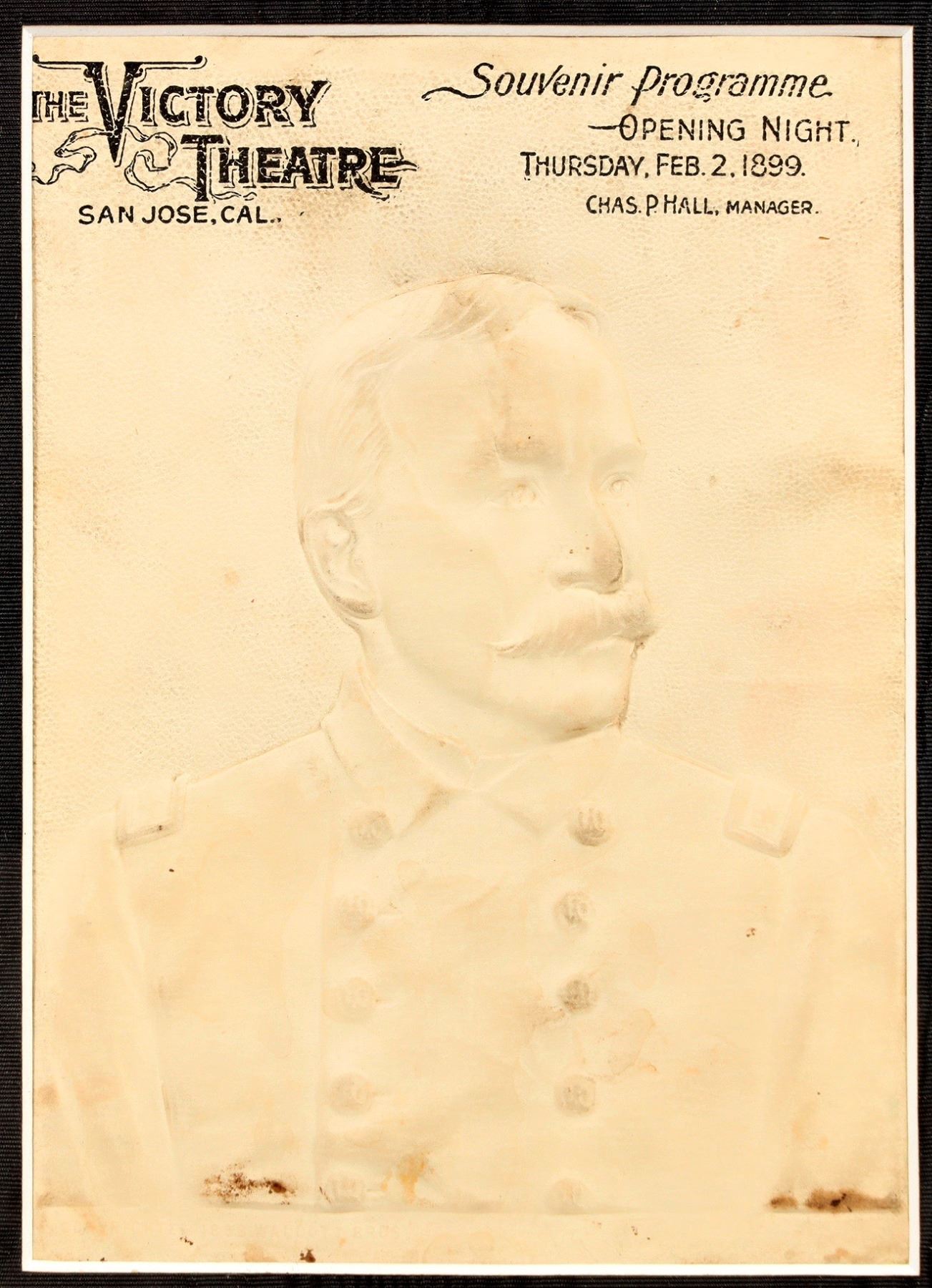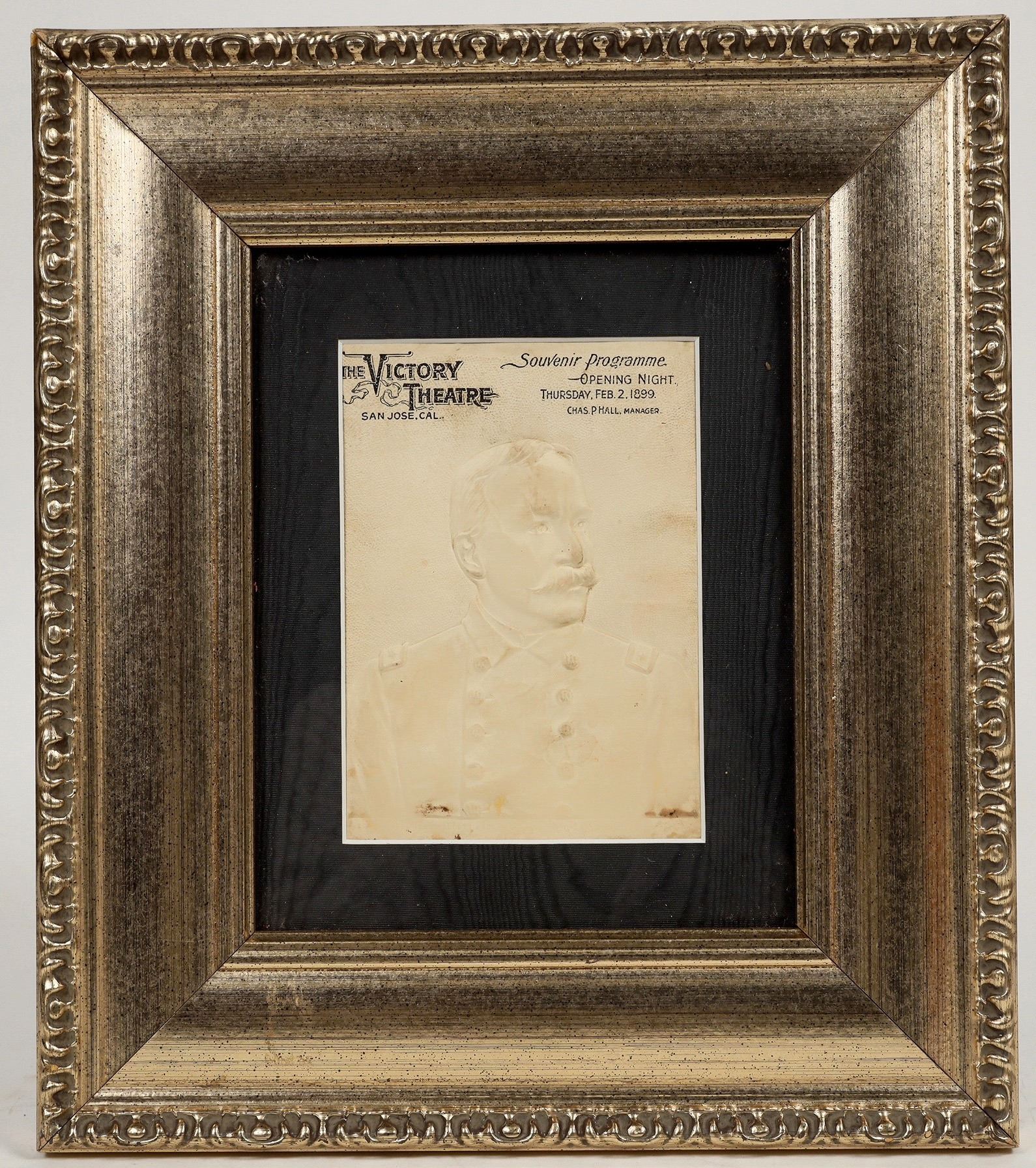 Framed souvenir programme from opening night, Thursday, February 2, 1899 at The Victory Theatre San Jose, California. Having become a national hero following the victory at the Battle of Manila Bay during the Spanish-American War (with the loss of only a single crewman on the American side), Dewey was encouraged to run for president in 1900. So this appearance was on his victory tour of the country. In May, 1900, he withdrew from the race and endorsed William McKinley. Frame is 13 x 16 inches, program is 5 x 7 inches. His portrait is in high relief.