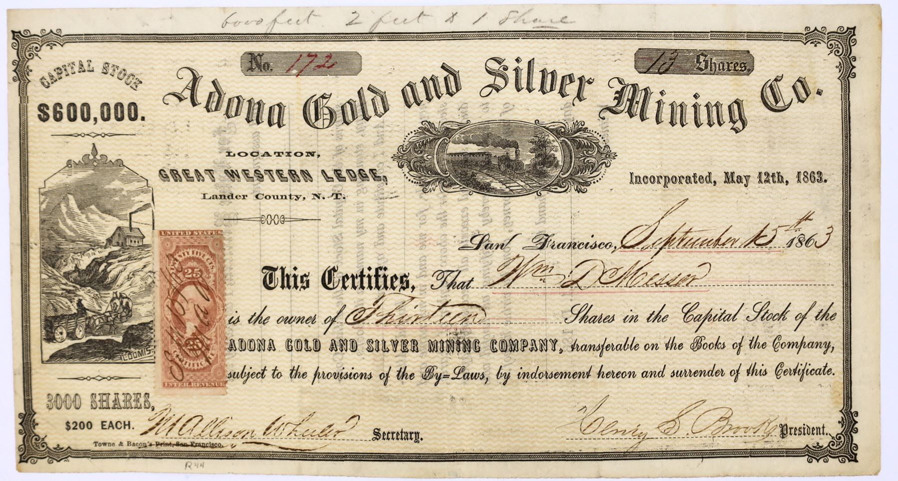 # 172 for 13 shares to William D. Messer (San Francisco Commission Agent) . Signed by secretary M Allison Wheeler (San Mateo Ranch) and president Henry S. Brooke (editor of Pacific). Dateline San Francisco, September 15, 1863. Incorporated May 12th, 1863. 25c Certificate revenue stamp. Not cancelled. Location: Great Western Lode, Big Creek district, Lander County, N. T. Larger side vignette of ore wagon on way to mill in mountains. Nice Loomis vignette printed by Towne and Bacon. Smaller center vignette is of steam train. Hand written: 6,000 feet @ 2 feet to a share. Some wrinkles. Very nice condition with no edge, corner of pinhole issues. Staining on reverse that does not affect front. John Irvine of Canyon City, Big Creek was the superintendent. Mine seems related to the Mansolana and Carolite as they appear in assessment notices together. Notes on research included.