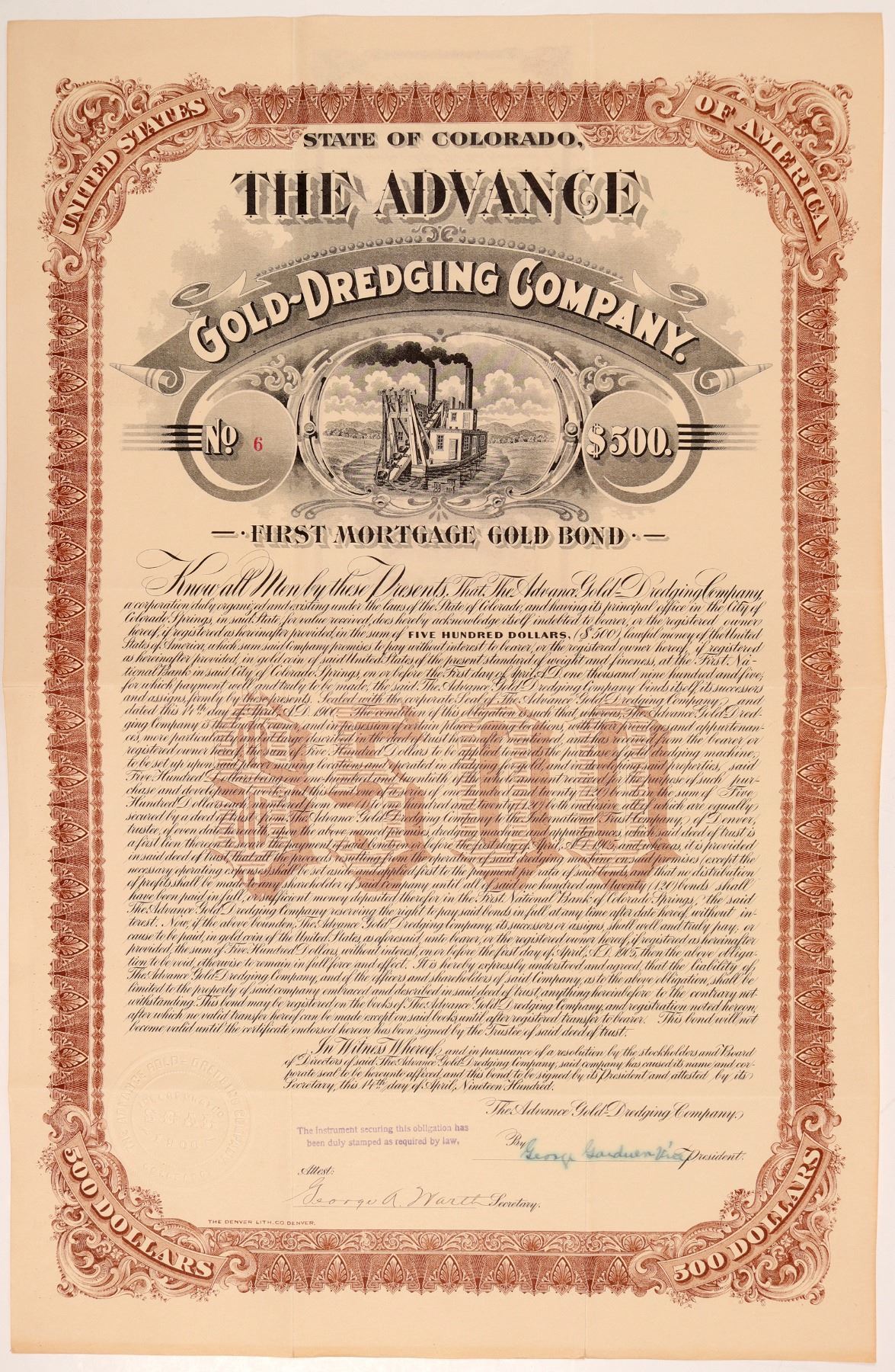 #6 $500 bond with nice gold dredge vignette. Office located In Colorado Springs.