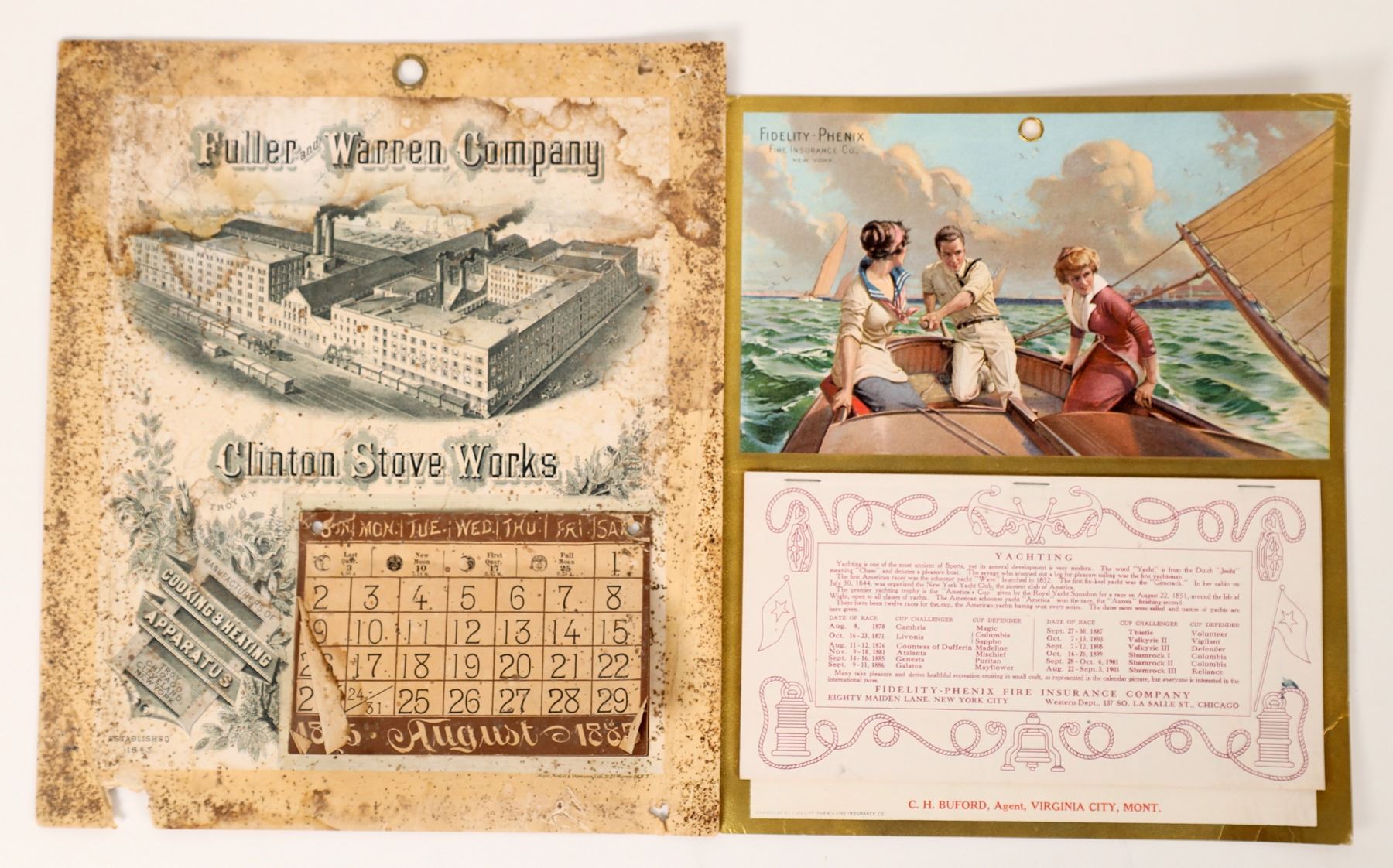 2 vintage advertising calendars. 1914 Fidelity Phoenix Fire Insurance. 1885 Clinton Stove works, partial months, has mold.