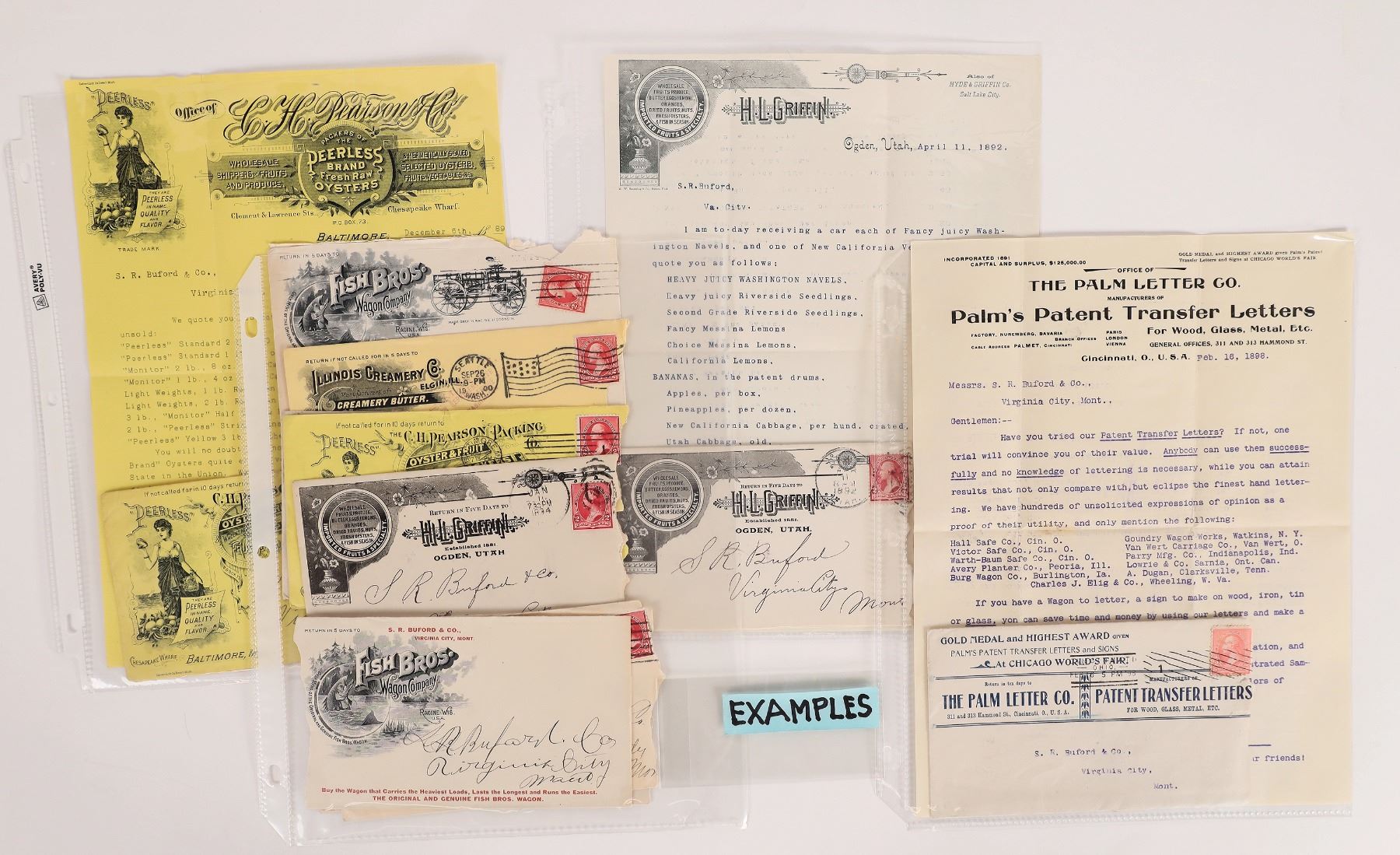 About 30 advertising covers with contents, c. 1889-1906, to S R Buford, Virginia City, MT. H L Griffin, Palm Letter, Singer Bros., Mitchell Lewis, H W Price, Peerless Oysters etc.