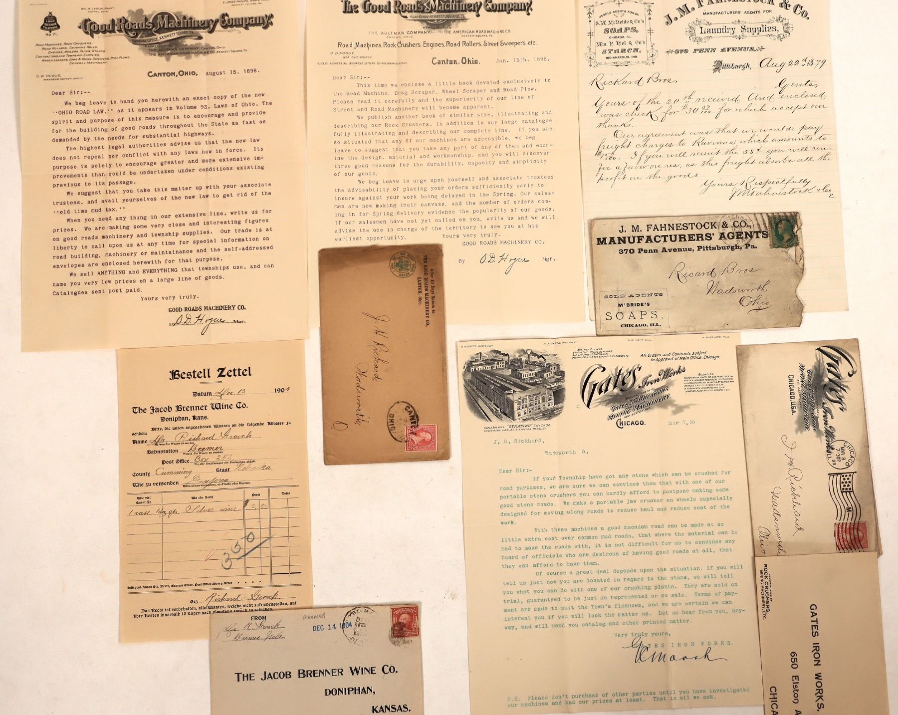 Collection of nine advertising covers and their contents, dating from 1879 to 1904. The covers originate from a variety of cities. The companies advertised include Gates Iron Works, the Jacob Brenner Wine Co., Owen Crist Penmanship, Climax Road Machine Company, Leather Preserver Manufacturing Corporation, J.M. Fahnestock and Co. Laundry Supplies, the Ohio Republican Party, and Good Roads Machinery Company. The covers and contents feature intricate, beautiful graphics and lettering.