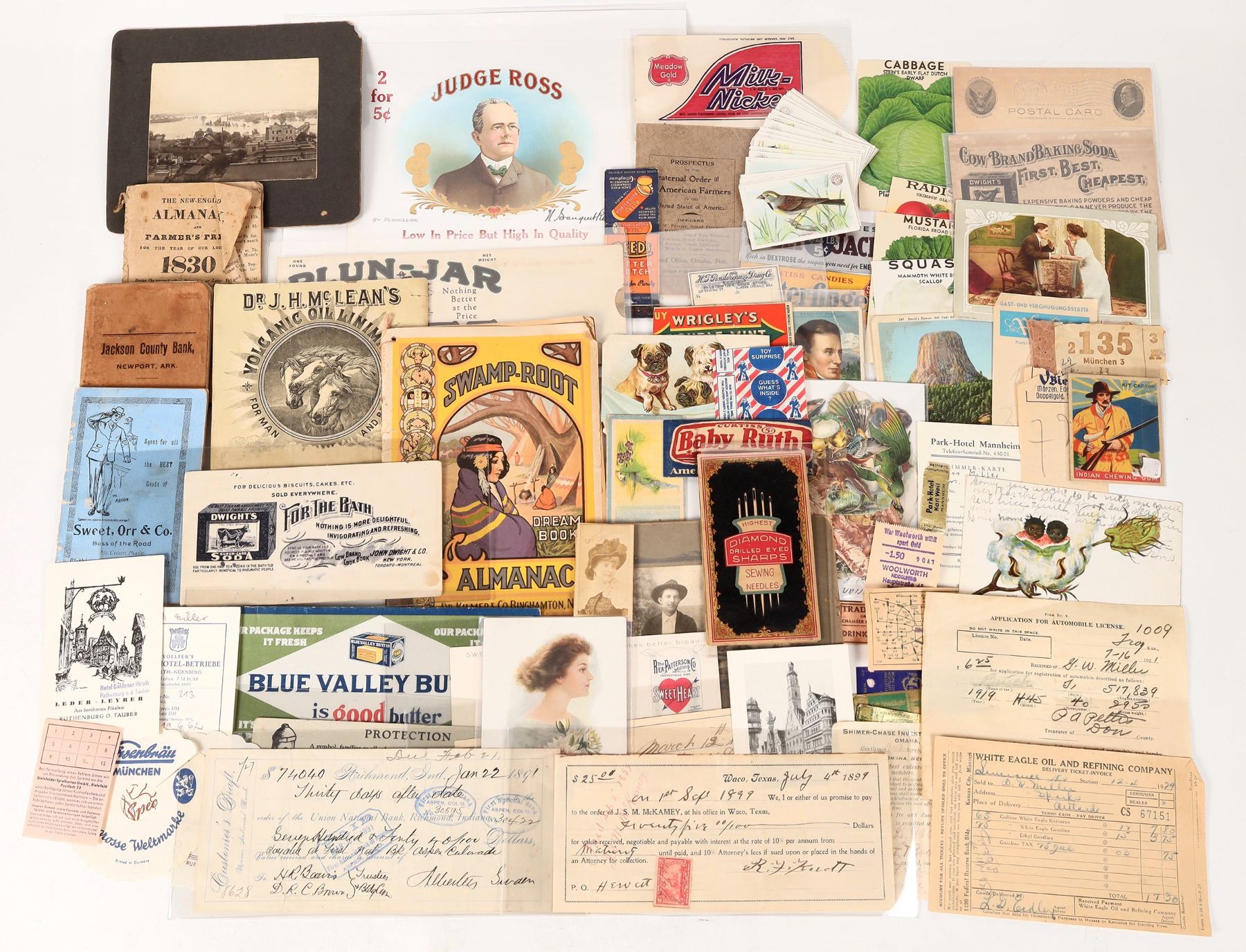 Group of advertising ephemera. About 25 Arm & Hammer mini bird cards, notebooks, postcards, Indian Gum, 1830 New England Almanac-condition issues, Wrigley's, Milk-Nickel and more.