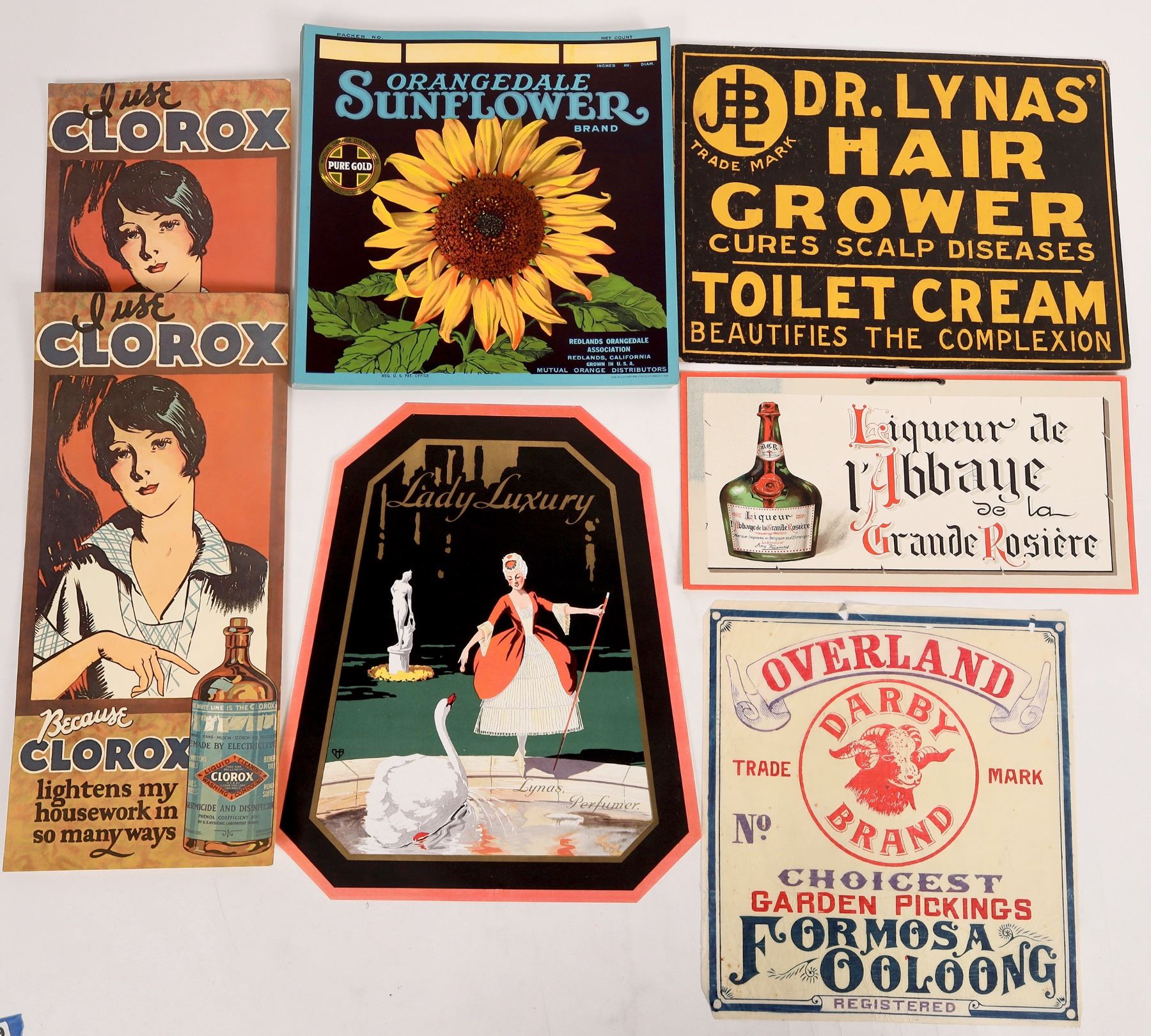 2x Clorox, about 100 Sunflower labels, Overland Tea-edge damage, Dr. Lyna's Hair Grower sign, Liquor de''Abbaye, Lady Luxury.