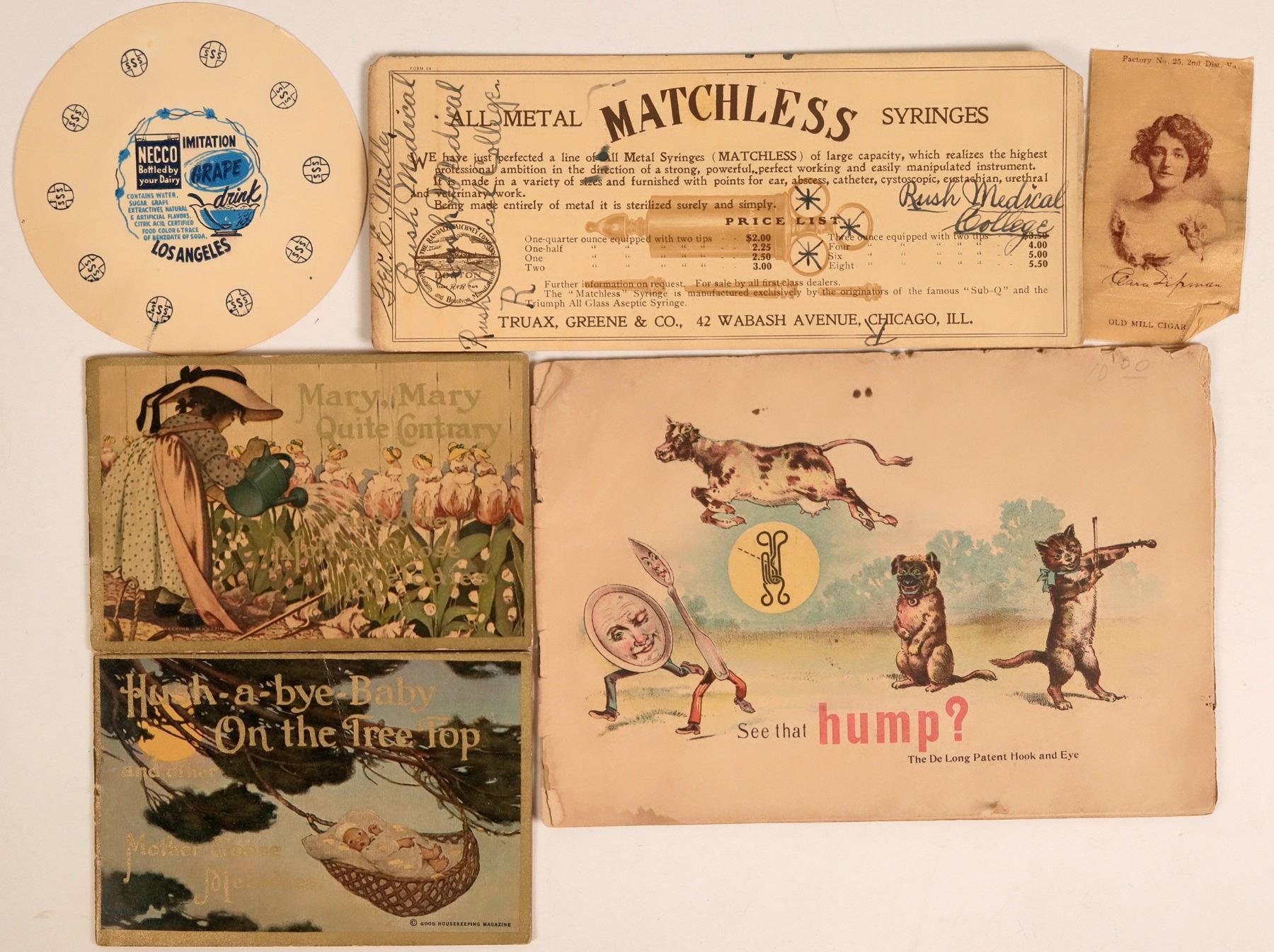 Lot of seven colorful advertising materials from the 1800s and early 1900s. Includes Colgate nursery rhyme booklets, and a nursery rhyme booklet by The De Long Patent Hook and Eye, with several of the familiar stories from long ago. Also, a fabric label from Old Mill Cigars, a Valentine handout from a fair for The Bean-Chamberlin Mfg. Co, All Metal Matchless Syringes price list and Necco imitation grape drink label. See photo for details.