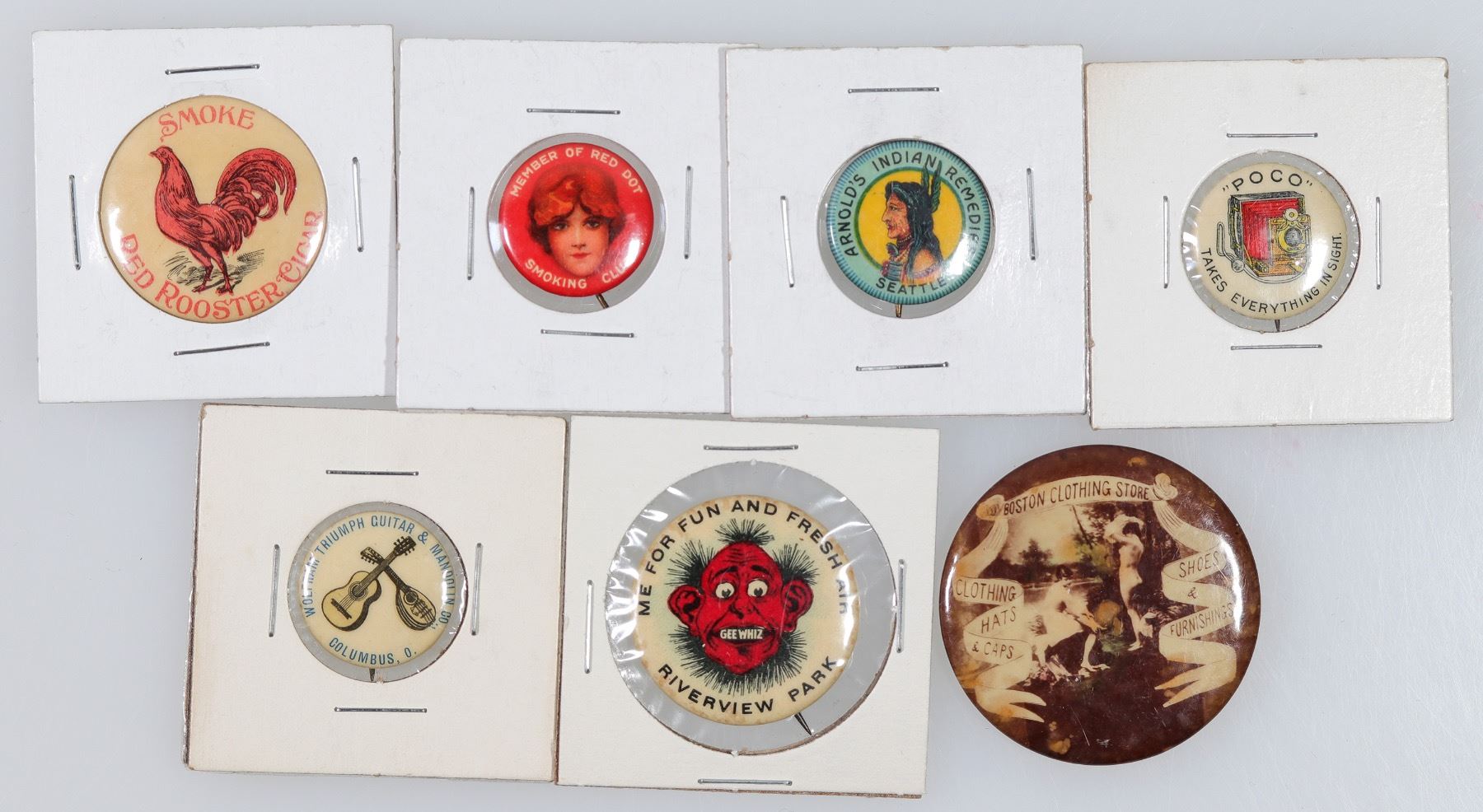 An advertising mirror for The Boston Clothing Store (Measures 2"), Six advertising pinbacks measuring 1" to 1.5" for Red Rooster Cigars, Riverview Park, Wolfram Triumph Guitar & Mandolin Company and more. All in great condition. Please see photos for more details. Boston Massachusetts