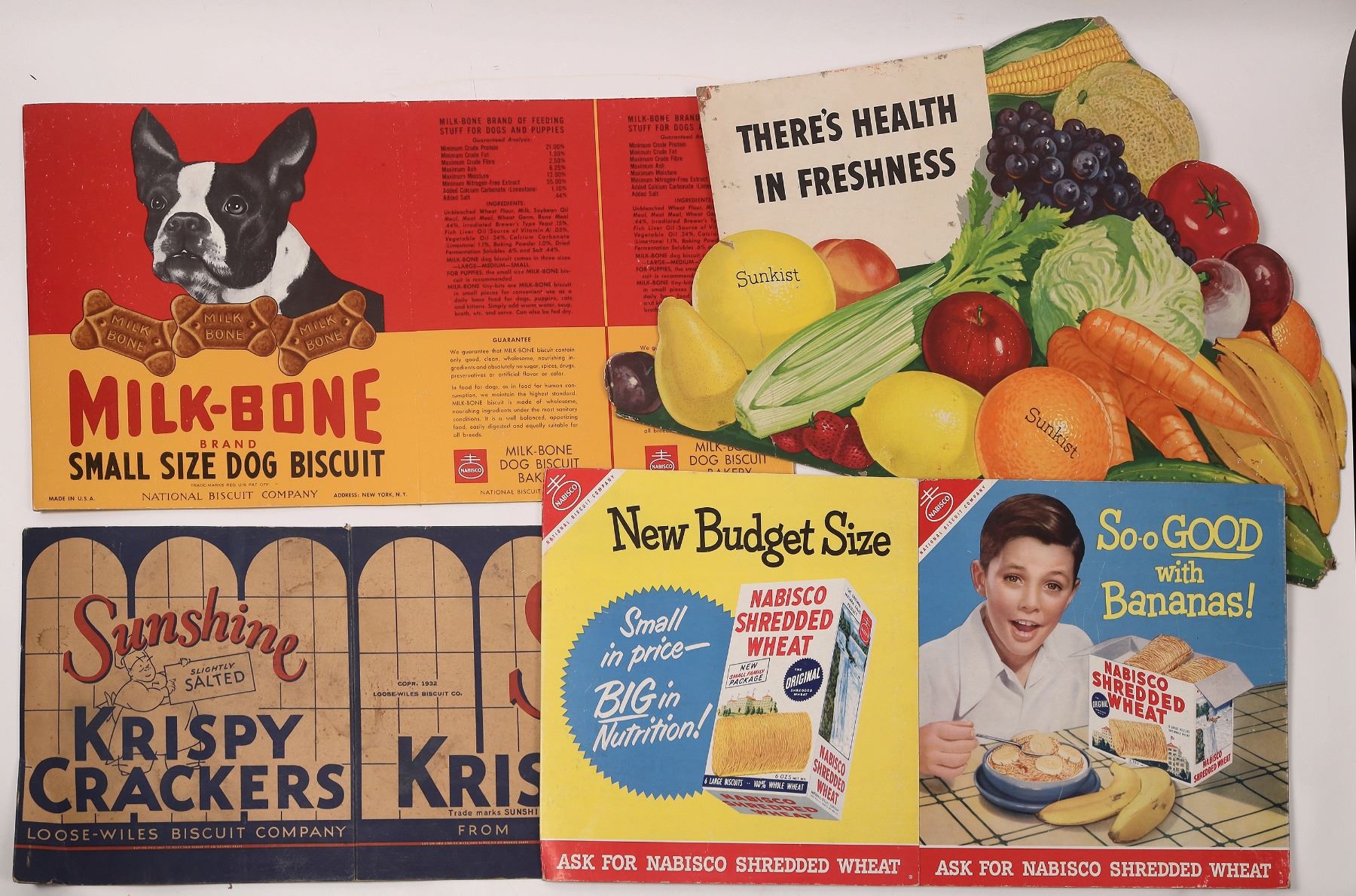 Lot of 4 large cardboard advertising pieces from 4 different US companies. (a) NABISCO dog biscuit sign, +/- 28 1/2" x 15", red and orange, includes B&W dog head photos w/brand ingredients; (b) Sunkist fruit and vegetable sign titled "There's Health in Freshness," triangular in shape, size +/- 29" x 19"; (c) NABISCO Shredded Wheat sign with titles including Honest Mommy it's Good!, opens up into a four-sided cube, each side 15 1/8" x 14 1/4"; and (d) Loose-Wiles Biscuit Company titled Sunshine Slightly Salted Krispy Crackers, opens up into a four-sided rectangular cube, each side 13" high, widths 26 1/2" front and back, 12" sides. Loose-Wiles piece states copyright 1932, all likely 1940s - 1950s. None torn or ripped apart, all in good condition.