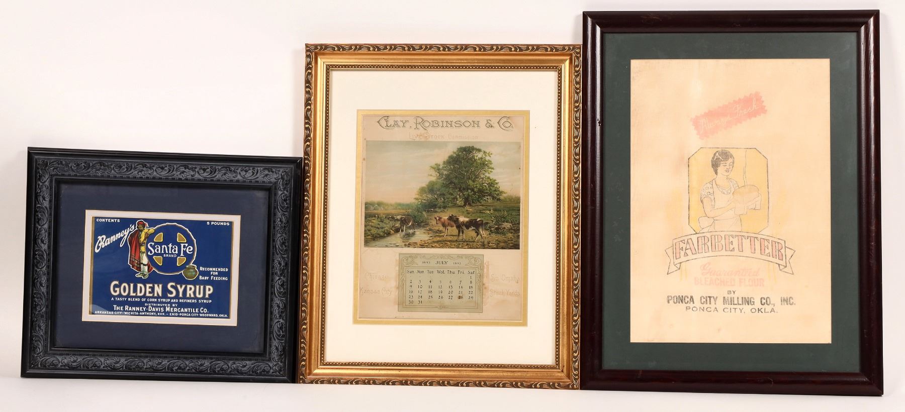 3 vintage framed advertising pieces. Clay, Robinson& Co. Live Stock July 1893 calendar-1.5" water stain and a few spots. Calendar 9.5x7.5", frame 16x13". Ranney's Santa Fe Brand Golden Syrup label 5x6.5", frame 10.5x12.5". Farbetter flour sack, Ponca, City, Okla. Sack 12.75x9" with condition issues, frame 17.5x13.5".