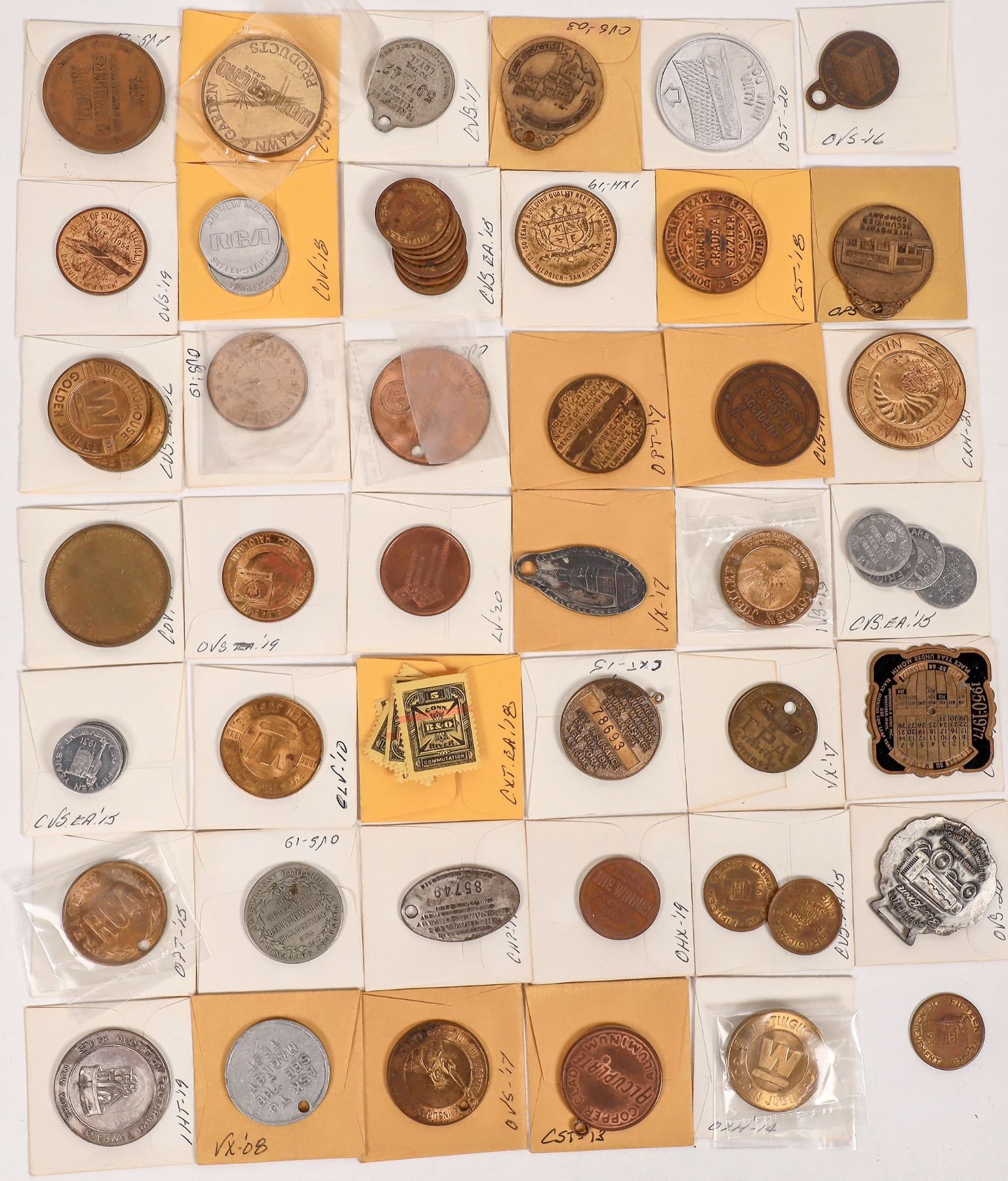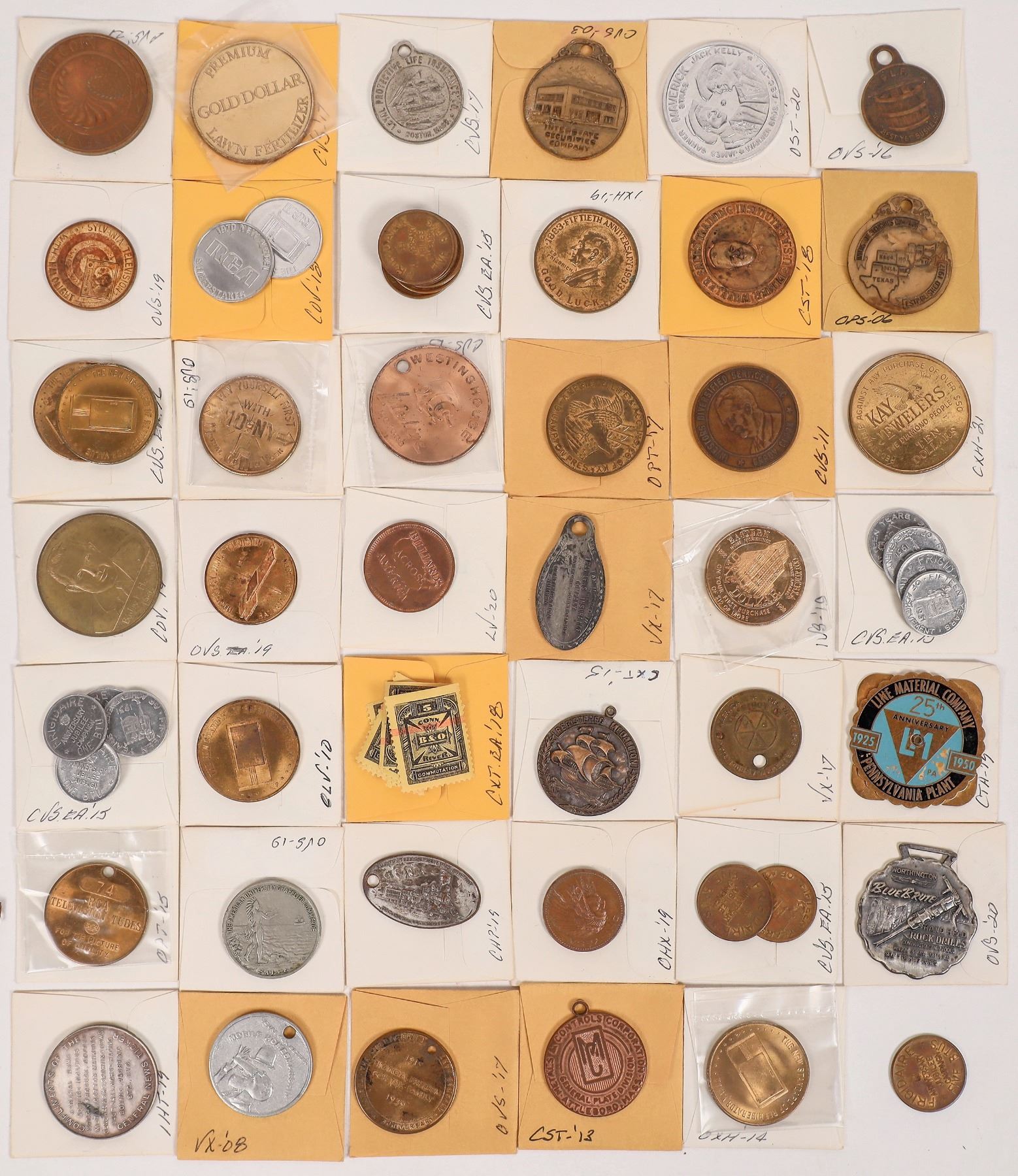 About 45 mostly metal advertising tokens. Grady Clark, B & O Railroad, Travelers Insurance, Interstate Securities, Frigidaire, Kay Jewelers, Westinghouse, Mutual of NY, Liberty Life Insurance, Sylvania etc.