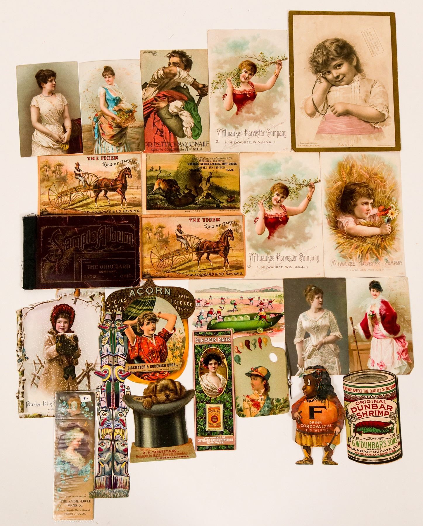 This is a collection of trade cards from around the USA. There is the Dunbar Shrimp Co. of Biloxi. Miss. dated 1865; there is a totem pole lunch menu from the Steamship "Spokane" dated 1908; Acorn stoves and ranges; the Elgin Saddlery and Harness Co. of Elgin, Ill. and more. Please see the photos for details.