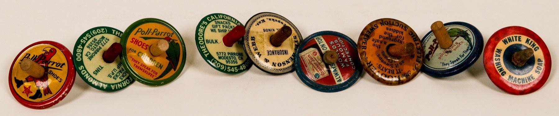 This is a collection of nine (9) spinners (or tops) advertising insurance and shoes etc. Some balance nicely.