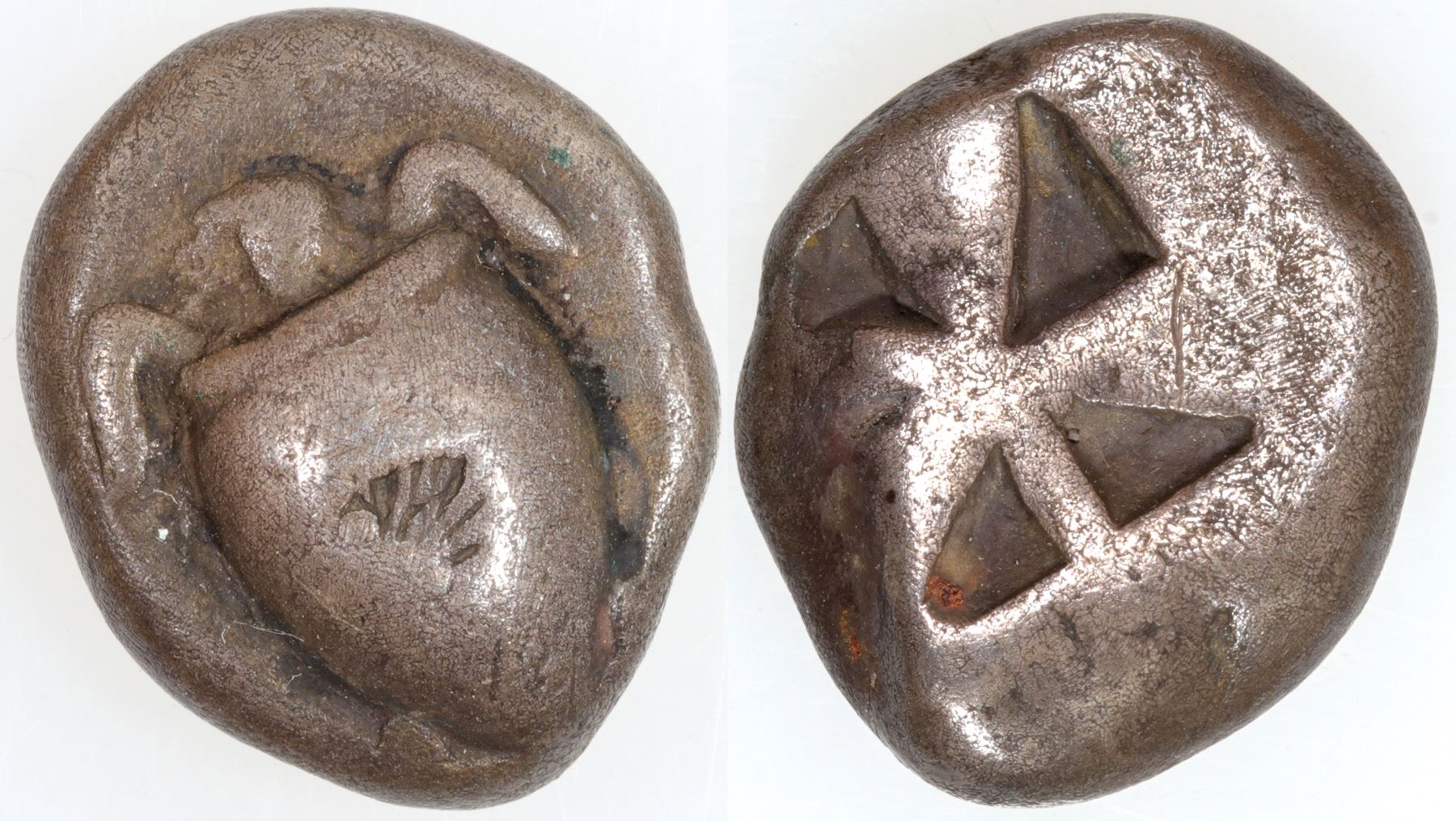 16 x 20 mm; turtle obverse, reverse punch mark. Like the Athenian silver tetradrachm, the Turtle coins from the Greek island of Aegina were ìbrandedî as a world trade coin because of a consistent design that developed over centuries. The design was first used around 650 B.C. and continued largely unchanged (although the turtle would have more details as time went on) for 300 years. foreign