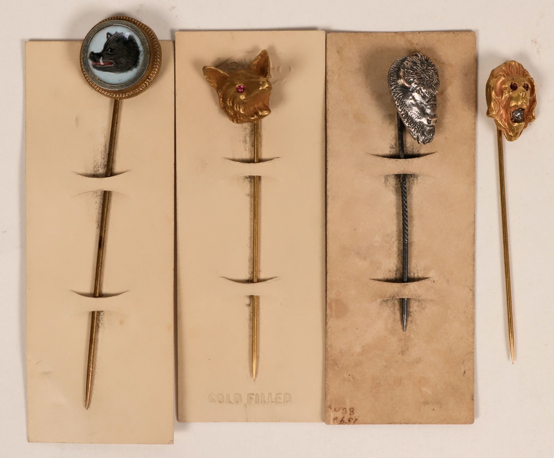 These pins are slightly larger in size with 4 different animal head designs, indicative of the Aesthetic Period of the Victorian Era seen in jewelry design 1) Lion with ruby eyes and a zircon stone in it's mouth, a wolf with a ruby eye, a buffalo in silver colored metal and a warthog painted on porcelain.